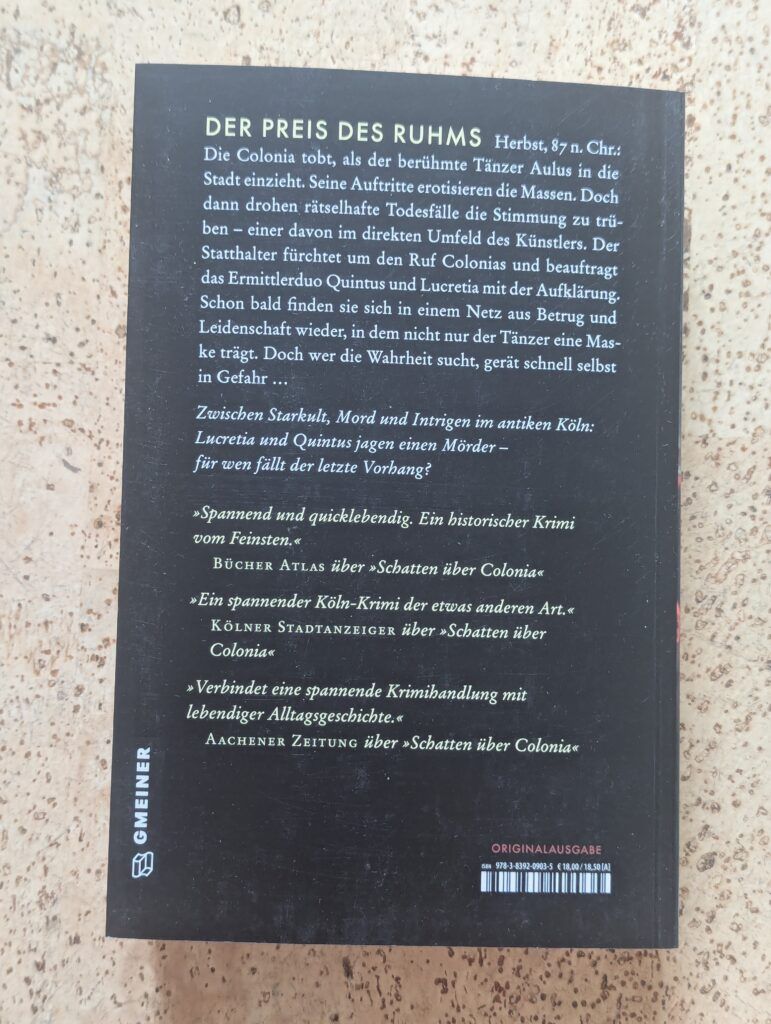 Nun kann man sich dank des wahrlich dicken Schmökers mit über 530 Seiten direkt in die Römerzeit von vor 2000 Jahren begeben und findet sich mit den Protagonisten Aulus und mit dem Ermittlerduo Quintus und Lucretia mitten in dem antiken Köln, das zu der damaligen Zeit den wohlklingenden Namen „Colonia“ trug. Dieses Werk ist ein absolut gelungener Krimi, der in dem römischen Köln spielt und gleichzeitig alle spannenden Krimielemente enthält wie auch jeden einzelnen Vorzug eines historischen Krimis mit sich bringt.