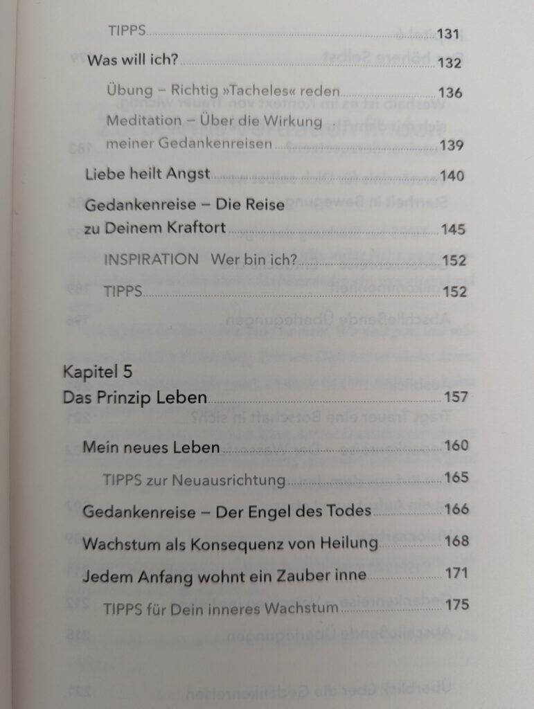 Ganz besonders wertvoll erscheinen mir die zahlreichen Gedankenreisen und Inspirationen, welche man in diesem Buch in einer großen Anzahl findet. Als besonderen Service bekommt man auch alle QR-Codes in dem Buch an die Hand, dank derer man sich dann mühelos alle vorgeschlagenen acht Gedankenreisen anhören kann. Das Buch ist eine höchst gelungene Mischung aus ganz konkreten Lebenstipps, was man sowohl kurz nach einem Todesfall alles unbedingt erledigen muss, wie auch in der nachfolgenden Zeit, und facettenreichen Einführungen in spirituelle Sichtweisen und Bereiche. So wird sich wirklich jede/r Trauernde/r durch die Autorin persönlich an die Hand genommen fühlen und kann aus einer großen Angebotsfülle die ganz konkreten und/oder spirituellen Hilfen zur Bewältigung der eigenen Trauer bestmöglich heraussuchen.