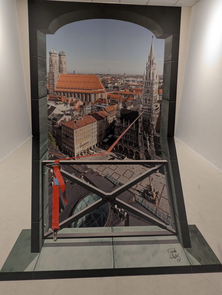 „Wenn Sie mit Ihrem Handy den QR-Code einscannnen, sehen Sie dieses Popartwandbild noch digital animiert.“, erklärte mir plötzlich eine adrett gekleidete Dame neben mir. Ich war voll der Bewunderung, dass sie sich mit allem so gut auskannte, war mir doch genau diese Dame just einige Minuten zuvor beim Trampolinshooting „Spring über den Dächern Münchens“ hervorgestochen, da sie einer Schülerinnengruppe höchst kompetent erklärt hatte, in welcher Pose und von welchem Standpunkt aus sie dort die besten Fotos schießen könnten.