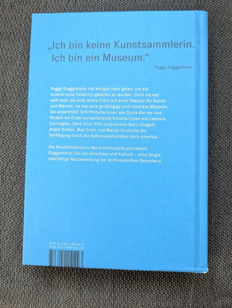 Mit dem Namen Guggenheim verband ich bis jetzt immer untrennbar den breits von außen absolut beeindruckenden Guggenheimmuseumsbau von Frank O. Gehry in Bilbao. Nun ist ganz aktuell im Molden-Verlag das beeindruckende Buch über Peggy Guggenheim von Mona Horncastle erschienen. Dieser Band reiht sich hervorragend in die bereits bestehende „Kluge Frauen“-Reihe des Molden-Verlags ein. Der promivierten Kunsthistorikerin ist eine umfassende Betrachtung von Peggy Guggenheim in all ihren unterschiedlichsten Seiten geglückt.
