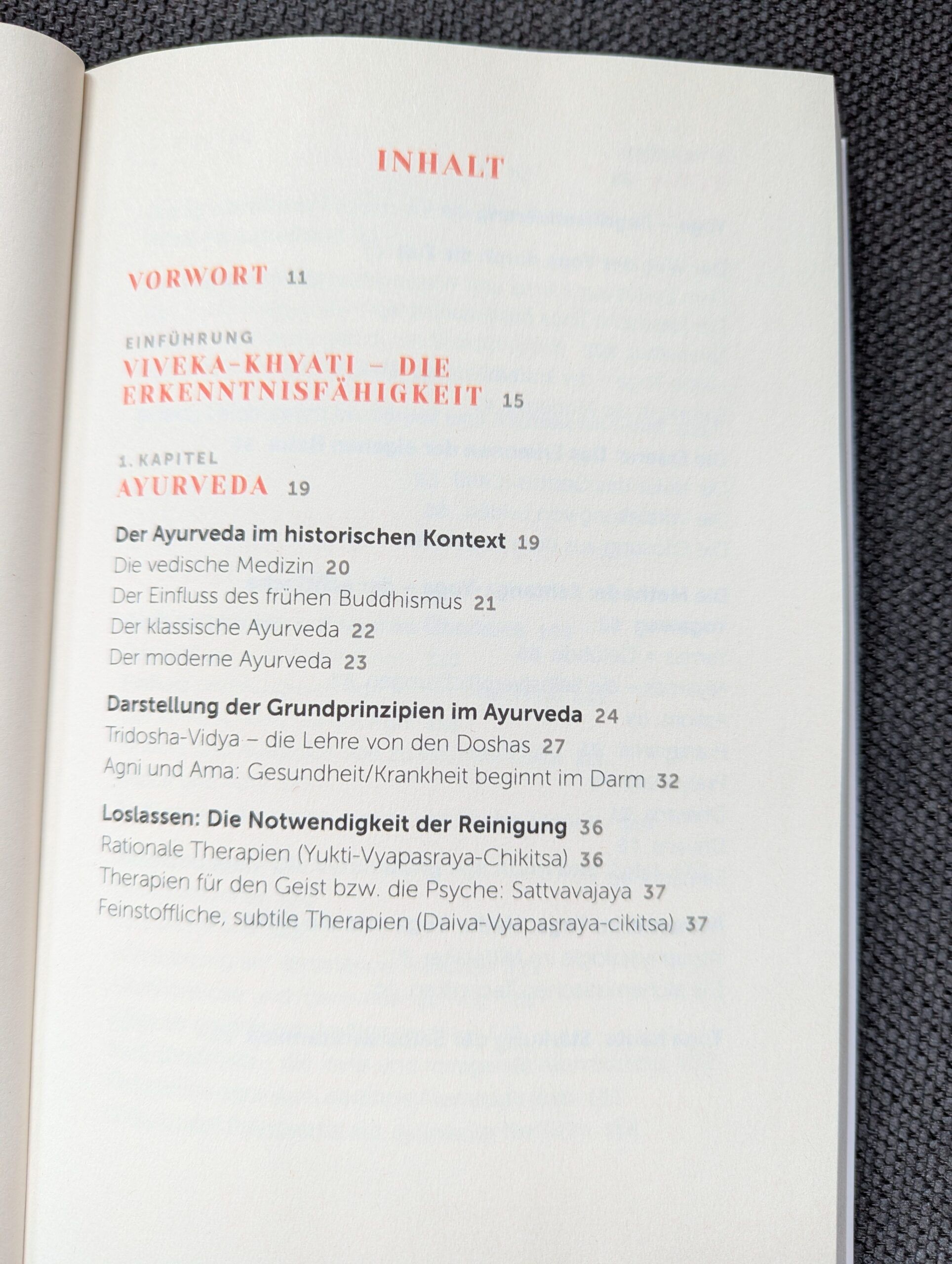 In ihrem (Berufs)Leben kombiniert sie ebenso die Yogapraxis in ihrem eigenen Studio am Ammersee wie auch die Ayurveda_Medizin in ihrer Praxis. Im Laufe des Buches wird man mit vielen Aha-Momente beschenkt, ist es doch überaus faszinierend, wie stark sich diese beiden umfassenden Lehren ergänzen, bereichern und äußerst positiv auf unsere psychische und physische Gesundheit auswirken. Das Buch ist in vier große Kapitel unterteilt: „Ayurveda“, „Yoga“, „Die Transformation“ sowie „Die regelmäßige Praxis für mehr Wohlbefinden und Klarheit“.