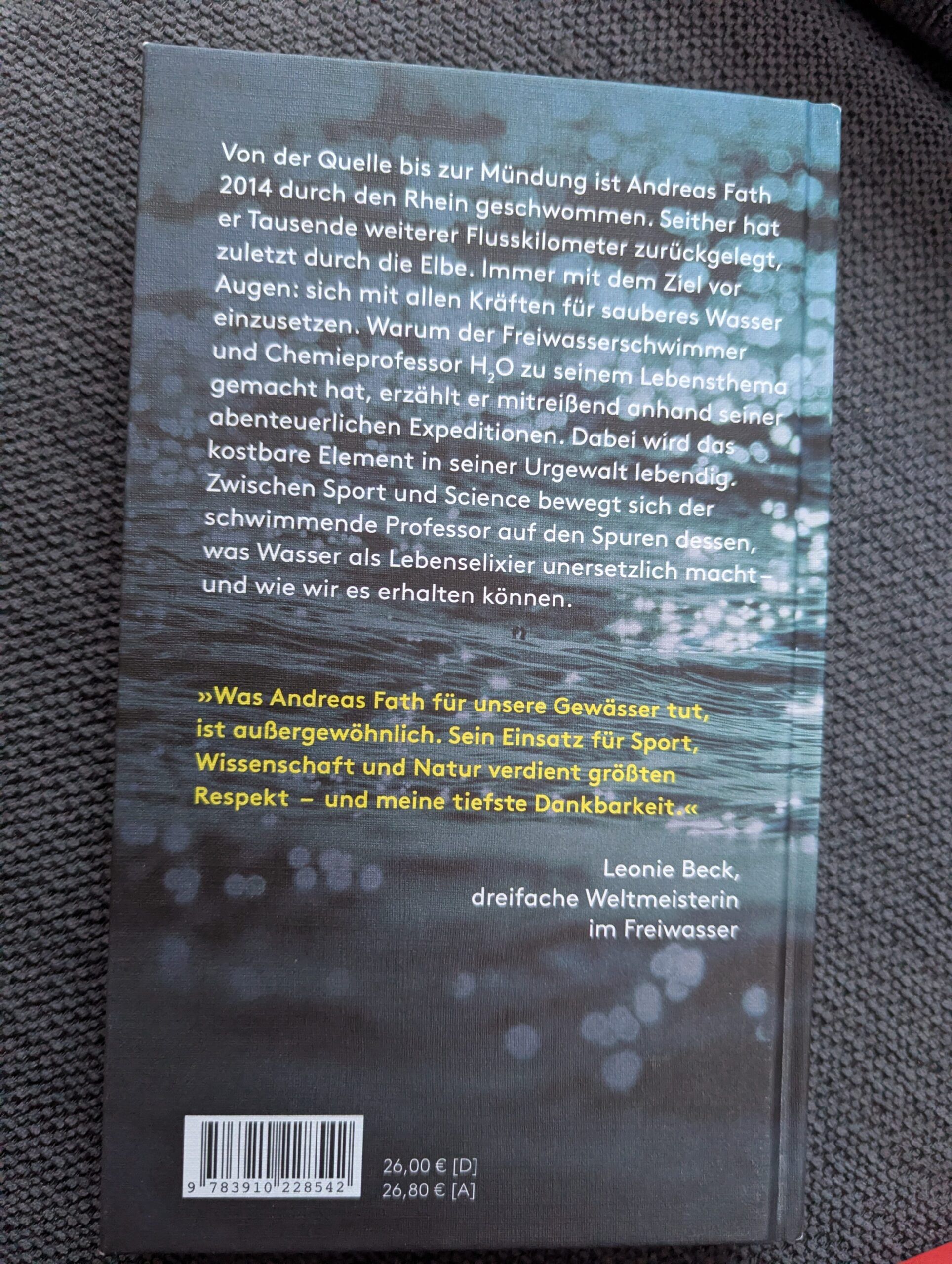 Aus Liebe zum Wasser betreibe ich seit Jahren das ganze Jahr hindurch sehr regelmäßig das Eisbaden in heimischen Gewässern, wovon mich nichts abbringen kann außer meine jetzt höchst unglückliche monatelange Lage aufgrund der so großen Fußoperation und der dadurch erzwungenen Immobilität. Der Autor Andreas Fath lehrt nicht nur an der Hochschule Furtwangen Chemie und beschäftigt sich damit mit Sicherheit auch mit allem Erdenklichen rund um H2O, sondern er ist der Passion, deretwegen er neben Chemie auch Sport studiert hat, auch noch während seiner Berufstätigkeit ausgesprochen treu geblieben. Und so verbindet er seine Schwimmbegeisterung mit einem so großen und vielseitigen  Umweltengagement, dass er hierfür 2025 mit dem Verdienstorden des Landes Baden-Württemberg ausgezeichnet wurde.