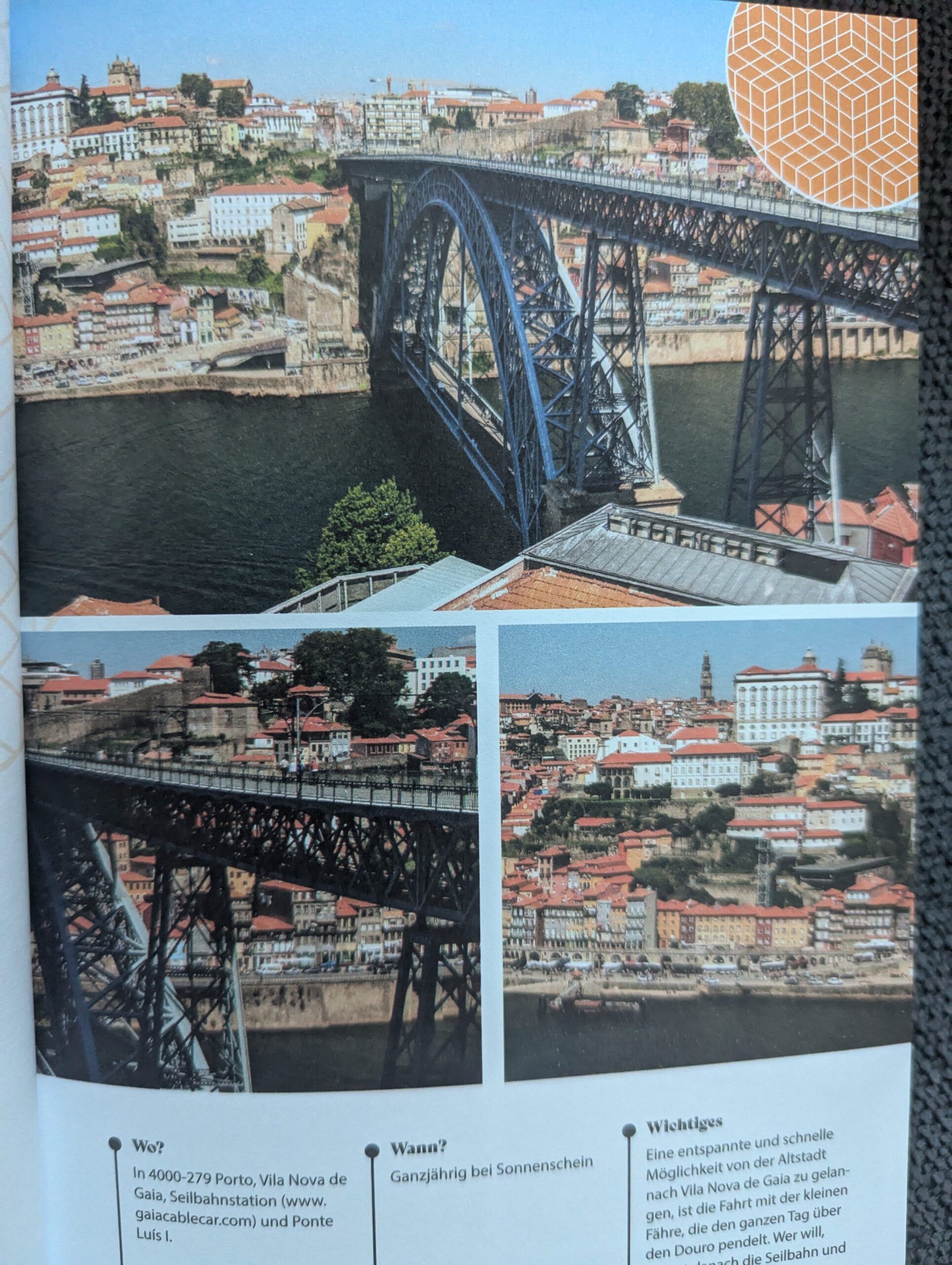 In diesem Werk findet man viel Erstaunliches für den Norden und die Mitte von Portugal, genauso wie für Alentejo und selbstverständlich auch die Algarve. Allein für Porto werden vier sehr reizvolle Unternehmungen sowie für Lissabon, zu dem es gleich neun Präsentationen gibt, vorgeschlagen. Unzählige, farbintensive Aufnahmen komplettieren dieses so reizvolle Werk, das einen bereits im Vorfeld der Reiseplanungen in die bezaubernde Kultur, Historie und Landschaft von Portugal entführt. Und so findet man höchst übersichtlich auf je einer Doppelseite die unterschiedlichsten Besichtigungs- und Aktivitätenvorschläge in ganz Portugal vorgestellt, welche durch reisepraktische Informationen und hilfreiche Webseiten komplettiert werden.