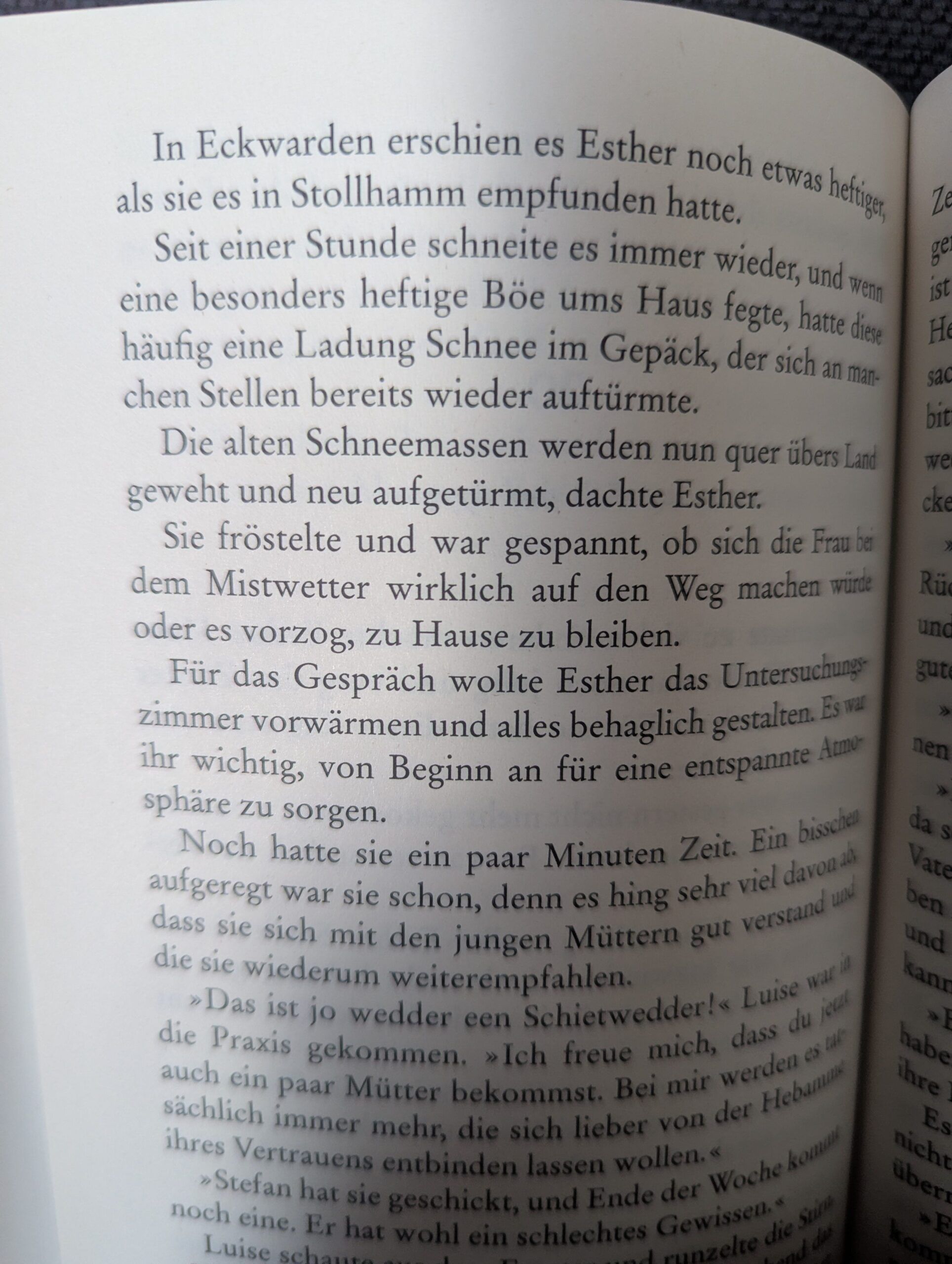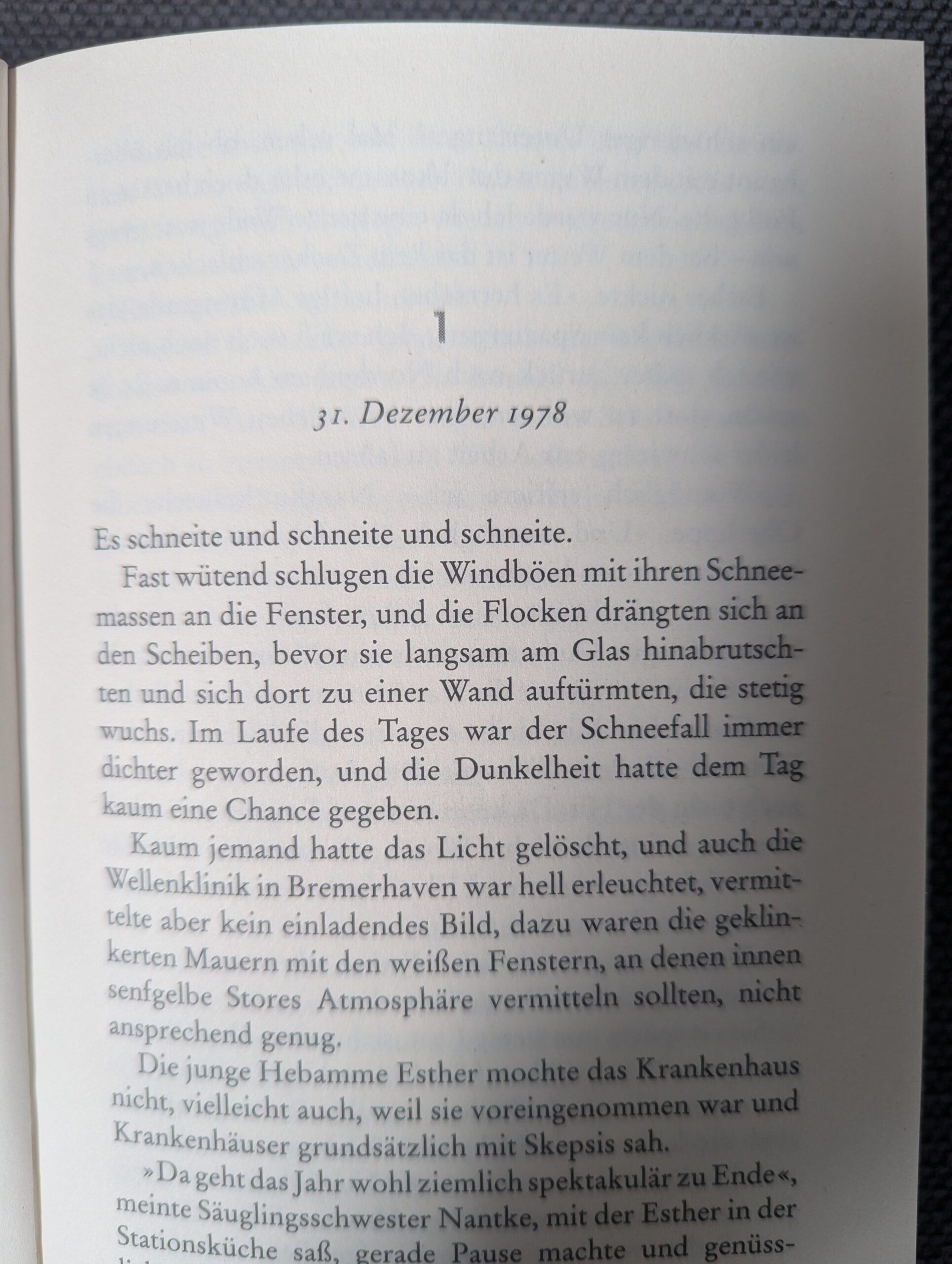 Auf über 240 Seiten begibt man sich auf eine kleine Zeitreise, bei der man sich im Jahre 1978 in Norddeutschland, genauer gesagt, im Landkreis Wesermarsch, befindet, wo die junge Hebamme Esther alle werdenden und frisch gebackenen Mütter in der Klinik mit bewundernswertem Engagement versorgt. Wie so viele andere, welche in den unterschiedlichsten Berufen weit mehr als Dienst nach Vorschrift betreiben, eckt auch die junge Protagonistin in der Hebammensaga immer wieder an und verzweifelt bisweilen an den eng gesetzten Grenzen im Klinikalltag. Als just in meinem Geburtsjahr, 1979, eine Schneekatastrophe ganz Norddeutschland lahmlegt, ist Esther zwangsläufig noch wesentlich mehr herausgefordert und mehr oder weniger dazu gezwungen, bestimmte Grenzen zu überschreiten, um völlig unkonventionell arbeiten und damit Menschenleben retten zu können.