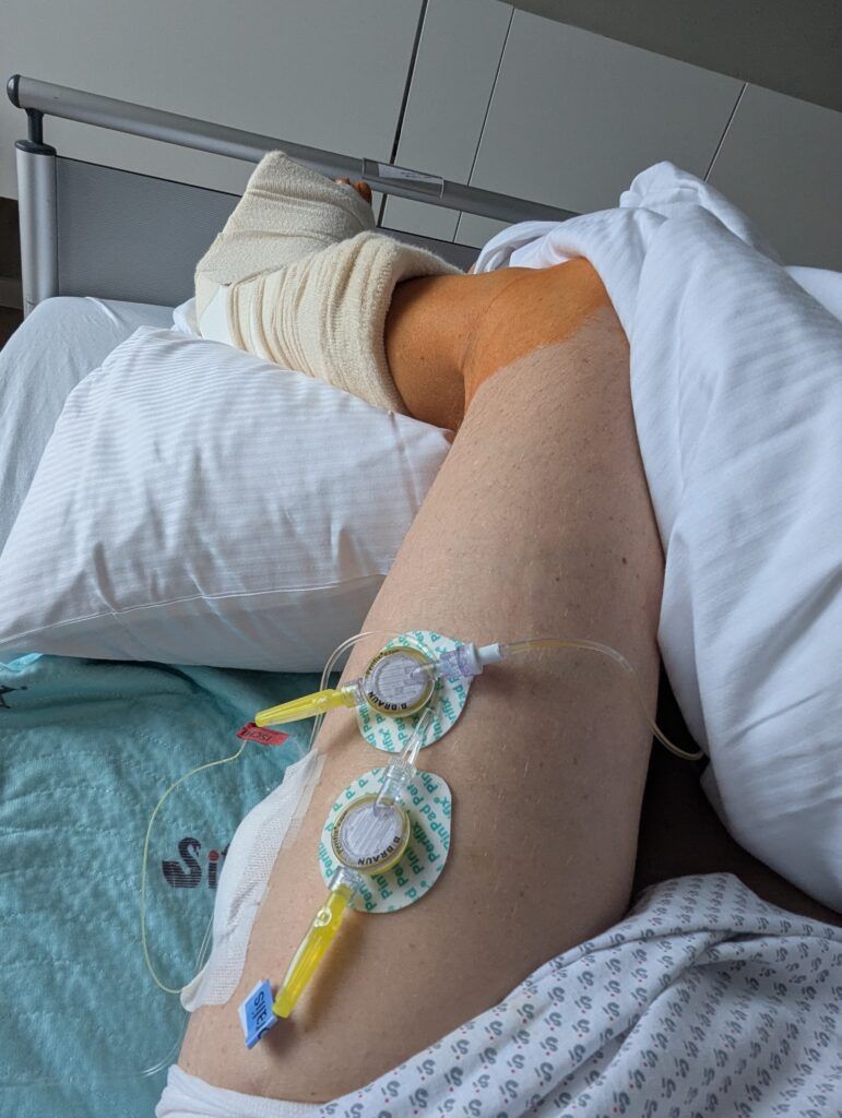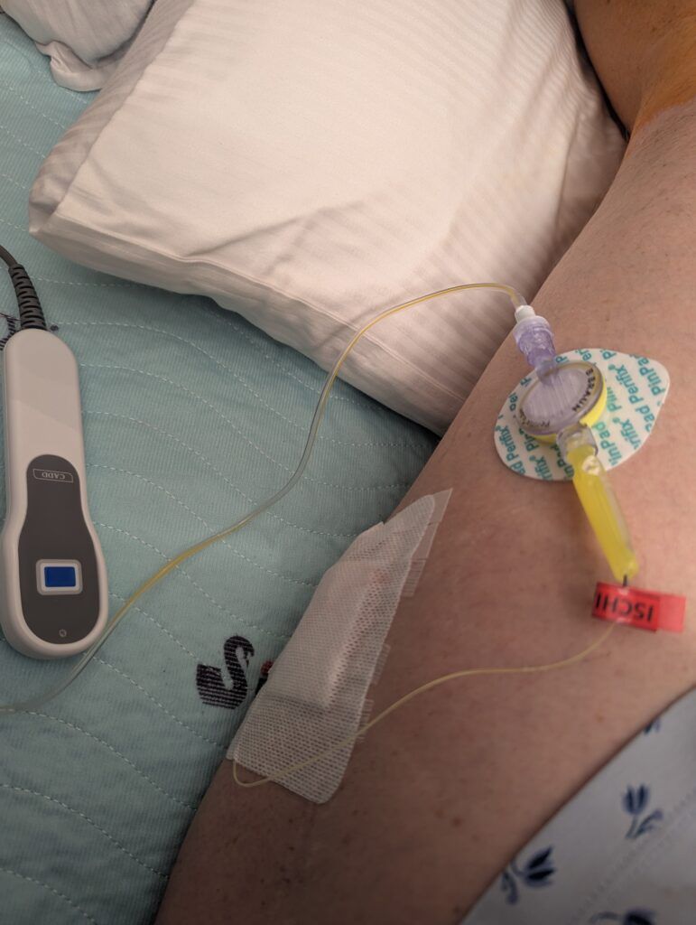 Leider nahm der Schlaf in keiner der Krankenhausnächte einen großen Teil der Zeit in Anspruch, gelang es mir doch nicht nur kaum in der erzwungenen Rückenlage und nicht in meiner bevorzugten Seitenlage zu schlafen, sondern verstärkten sich auch abends/nachts zuverlässig meine Knochenschmerzen so stark, dass an Entspannung nicht zu denken war. Und dann gab auch noch der Perfusor, der in regelmäßigen Abständen automatisch über die im Oberschenkel gesetzten Katheter ein Lokalanästhetikum verabreicht, um 3.30 Uhr Alarm, dass kein Betäubungsmittel mehr enthalten sei. Nach einem relativ umständlichen Wechsel hatte die Nachtschwester offenbar den Katheter nicht mehr richtig angestöpselt, so dass alles auf die Bettdecke tropfte statt zum heftig schmerzenden Fuß zu gelangen.
