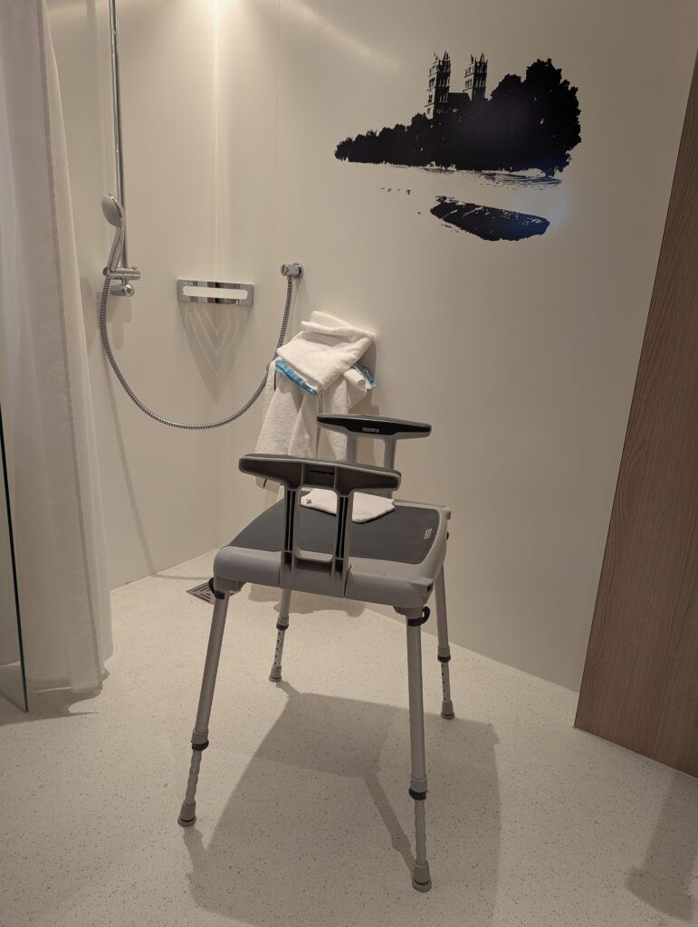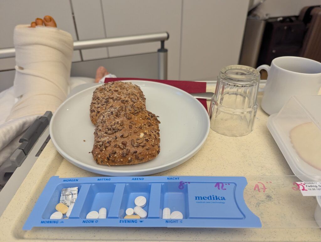 Übrigens kann ich berichten, dass ich die Tage im Krankenhaus auch ohne das Anschalten des Fernsehers gut ausgefüllt verbrachte. Den sehr schlafarmen Nächten folgte stets ein früher Morgenbeginn in der Klinikroutine, dem sich ein Frühstück anschloss, das weniger ein kulinarisches Vergnügen als vielmehr die Grundlage für die Einnahme der ersten der etwa 15 täglichen Tabletten darstellte. Danach quälte ich mich mit dem Stehwagen, bei dessen Benutzung zuverlässig gleich bei der ersten einseitigen Belastung ein großer Schmerz in meine rechte Hüfte stach, in das Bad. Notdürftig wusch ich mich und war dabei erstaunt, wie umständlich sich dies gestaltet, wenn man alles quasi nur im Flamingostand betreiben kann, und welch akrobatischer Leistung es bedarf, mit einem Gehwagen „bewaffnet“ und Schmerzkathetern im Oberschenkel, überhaupt erst einmal einen Unterwäschewechsel zu vollziehen, ohne irgendwelche Kabel herauszuziehen.