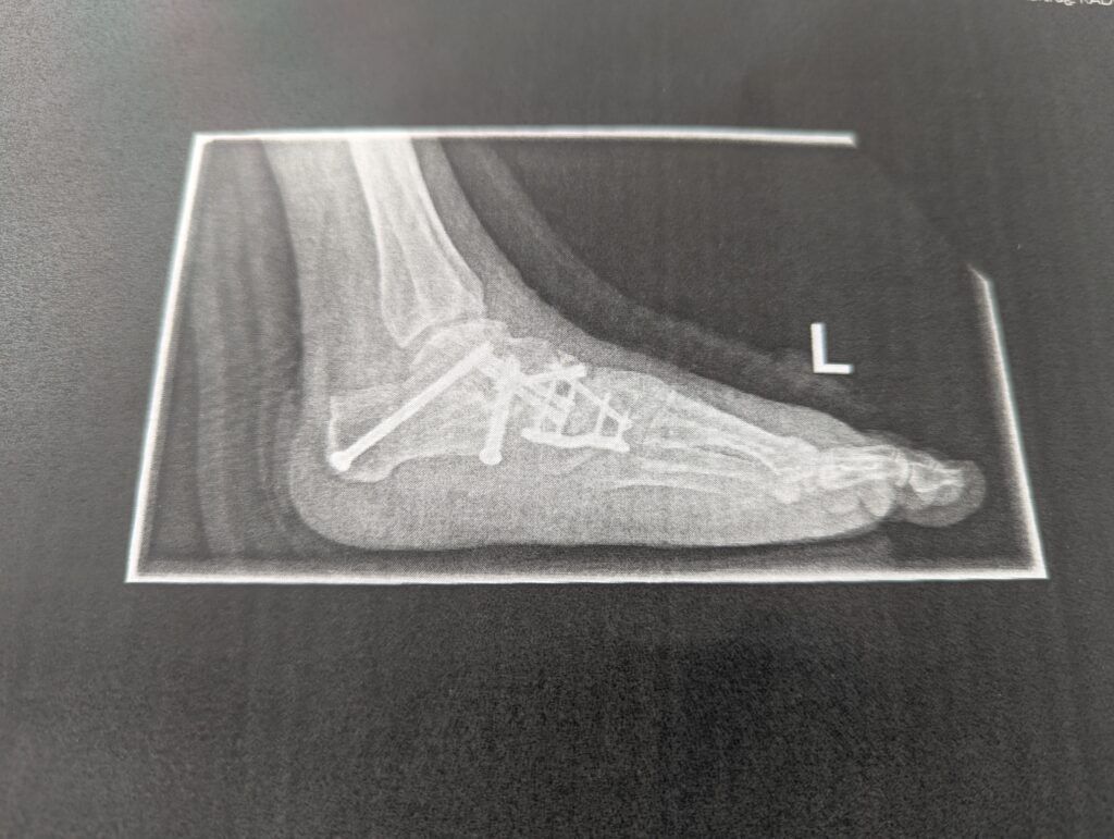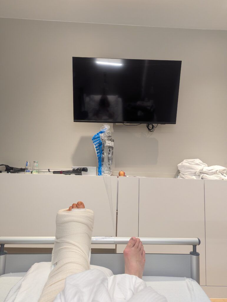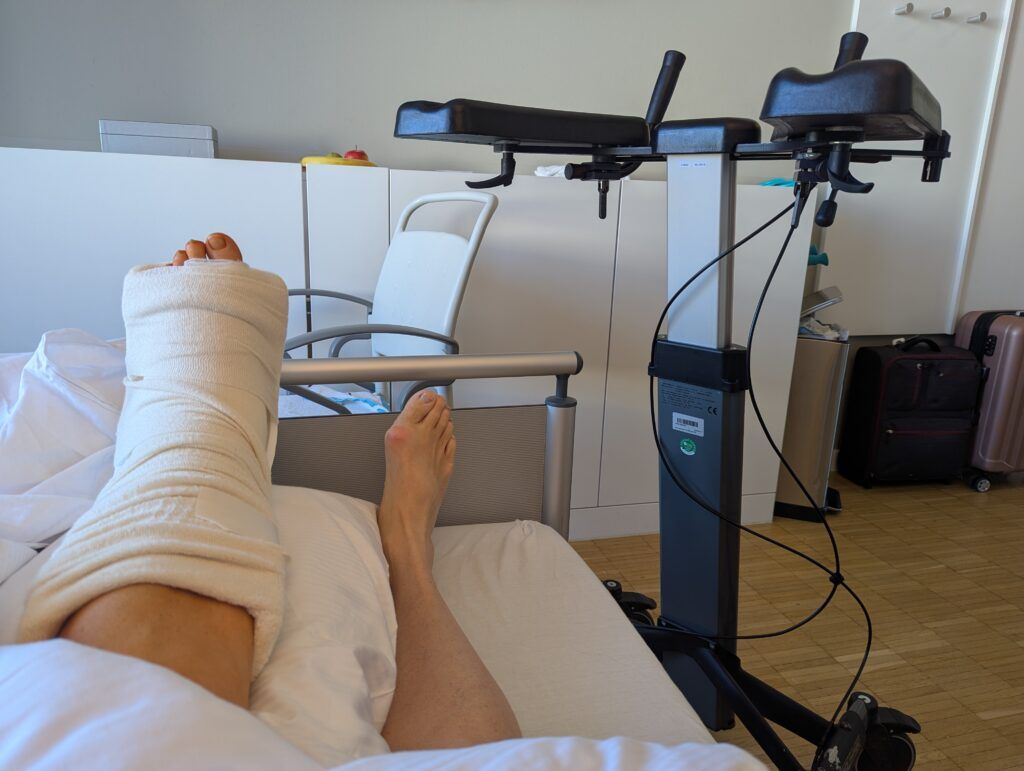 Bei der morgendlichen Visite am Entlassungstag begutachtete der Operateur meinen Fuß und war mit dem Ergebnis so weit zufrieden. „Wir haben so viele Knochen zersägt, da sind die großen Blutergüsse völlig normal.“ beruhigte er mich. Nachdem ich noch genauestens instruiert wurde, wie lange kein Wasser an meinen Fuß darf – ich leide jetzt schon sehr darunter, in diesem Herbst und Winter in keiner Weise meinem liebgewonnenen Ritual des wöchentlichen Eisbadens nachgehen zu können – ermahnte er mich beim Rausgehen noch einmal eindringlich, was es als allerwichtigstes für die kommenden sechs bis acht Wochen zu beachten gäbe. Verletzt, wie sich einige meiner Familie mir gegenüber auch während meiner Krankenhauszeit verhalten haben und wahrscheinlich auch der Übermüdung geschuldet, verstand ich dabei zunächst etwas ganz anderes, als wie es der Professor tatsächlich gesagt hatte. „Nicht aufregen!“, er hatte jedoch „Auf keinen Fall auftreten!“ gesagt…Immerhin fällt mir das Auftretverbot noch etwas leichter als der Vorsatz der Gelassenheit…