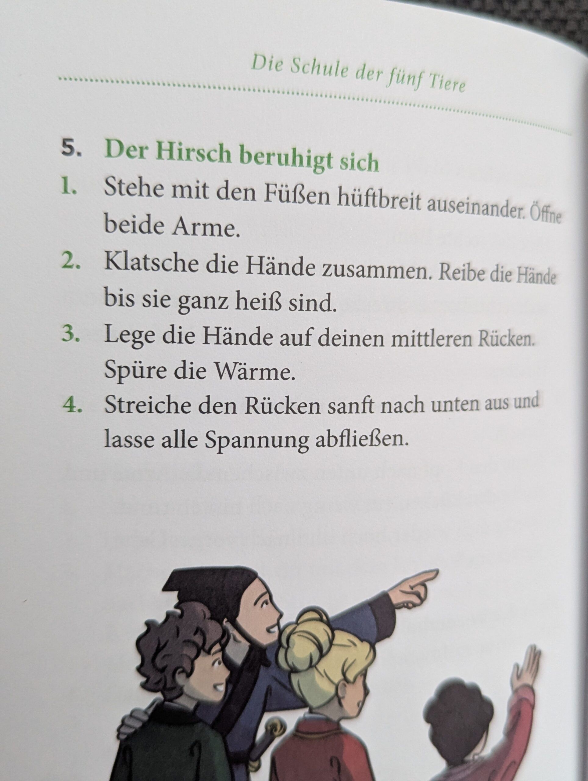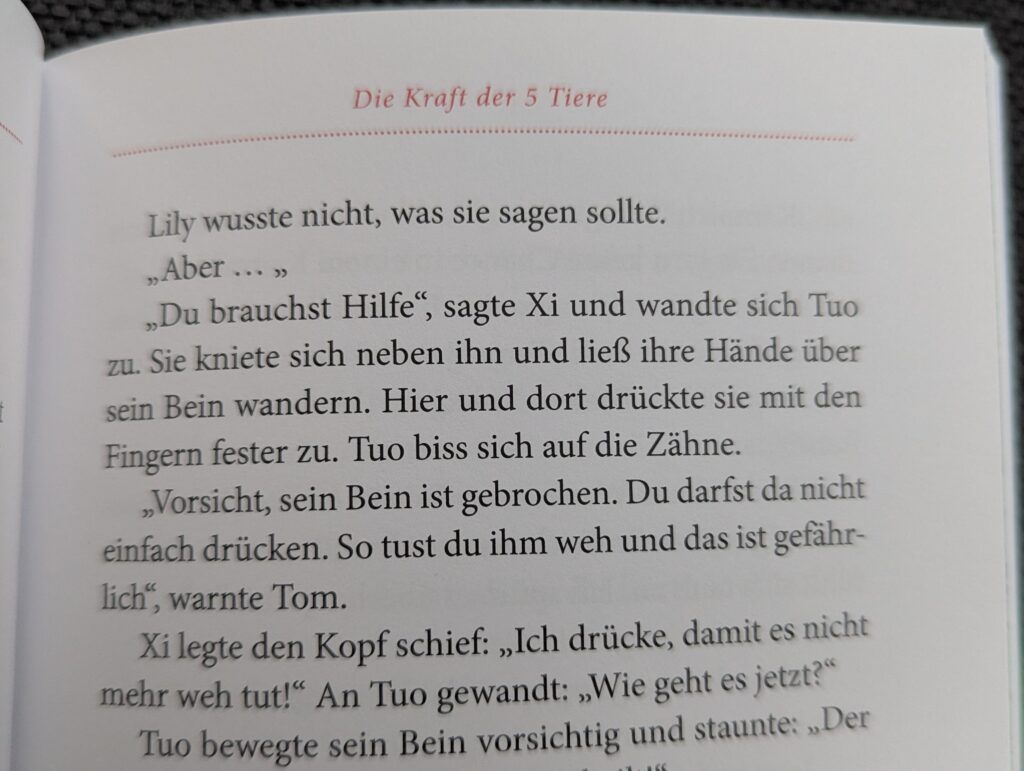 Hätte ich damals schon das im Windpferd-Verlag ganz neu erschienene Buch „Lilly & Tom – Die Kraft der 5 Tiere“ gehabt, hätte ich wohl deutlich mehr von den heilsamen und gleichzeitig äußerst kindgerechten Qigongpositionen wie auch Meditationen zur Verfügung gehabt…Das Buch ist in drei große Teile geteilt, von denen der erste Teil in Form einer wunderbaren und einfühlsamen Geschichte, welche die Kinder sowohl selbst lesen können oder die sich auch bestens zum Vorlesen eignet, den meisten Platz einnimmt. Anschließend folgen höchst einfallsreiche und bestens zu praktizierende Yoga- und Qigong-Übungen für Klein und Groß, welche zudem mit vielen Positionsbeispielen illustriert sind.