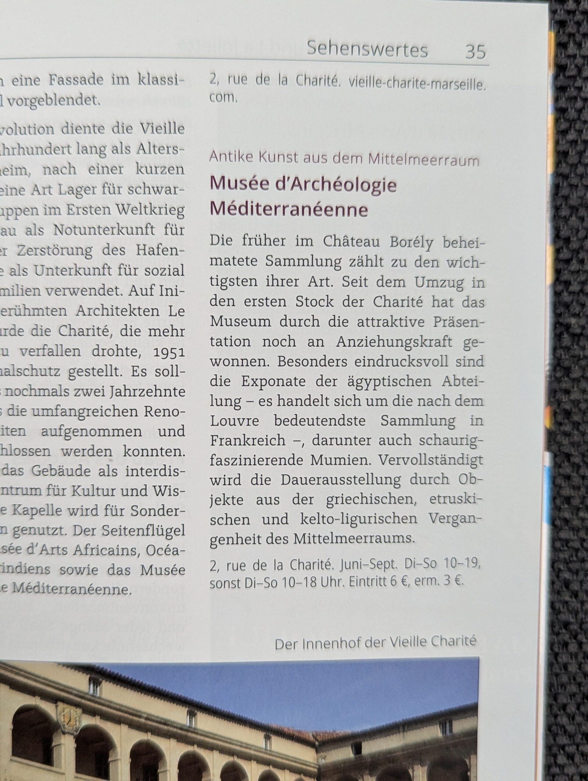 Er schreibt bereits im Vorwort völlig zu Recht, wie sehr sich diese Stadt seit der Wahl zur Kulturhauptstadt im Jahr 2013 gewandelt hat, und zwar nicht nur auf überaus sichtbare architektonische Weise, sondern gleichermaßen auch auf der geistigen Ebene. Die Begeisterung des Autors für diese faszinierende Stadt ist auf jeder einzelnen Seite zu spüren. Und so darf man sich nach der Lektüre der ersten Seiten, dank derer man bereits einen groben Überblick über die Hauptsehenswürdigkeiten und köstlichem Essen bekommt, an sechs höchst abwechslungsreich gestalteten Tourenvorschlägen in dieser Metropole erfreuen. Und selbstverständlich dürfen in dieser so reizvollen Umgebung natürlich auch die Ausflüge in die nähere und etwas fernere Umgebung nicht fehlen. So erfährt man dank des Reiseführers nicht nur sofort, welches die schönsten Calanques-Stellen sind, sondern auch welche umliegenden (Fischer)Städtchen ganz besonders eines Besuchs wert sind oder aber auch, welche Stadt sich in der Nähe von Marseille befindet, welche immer wieder als allererstes genannt wird, wenn man die Franzosen nach ihrer Wunschortstadt befragt.