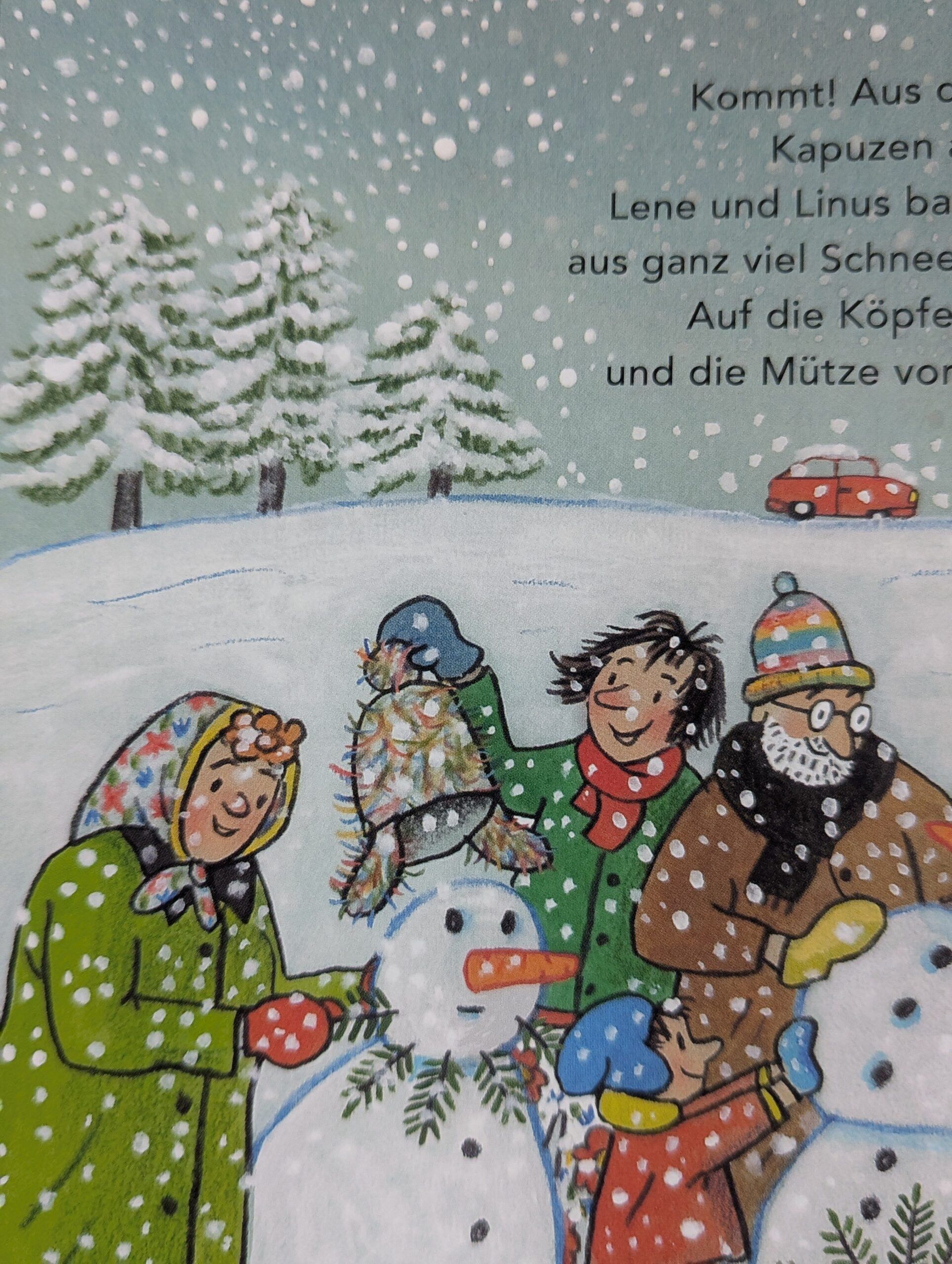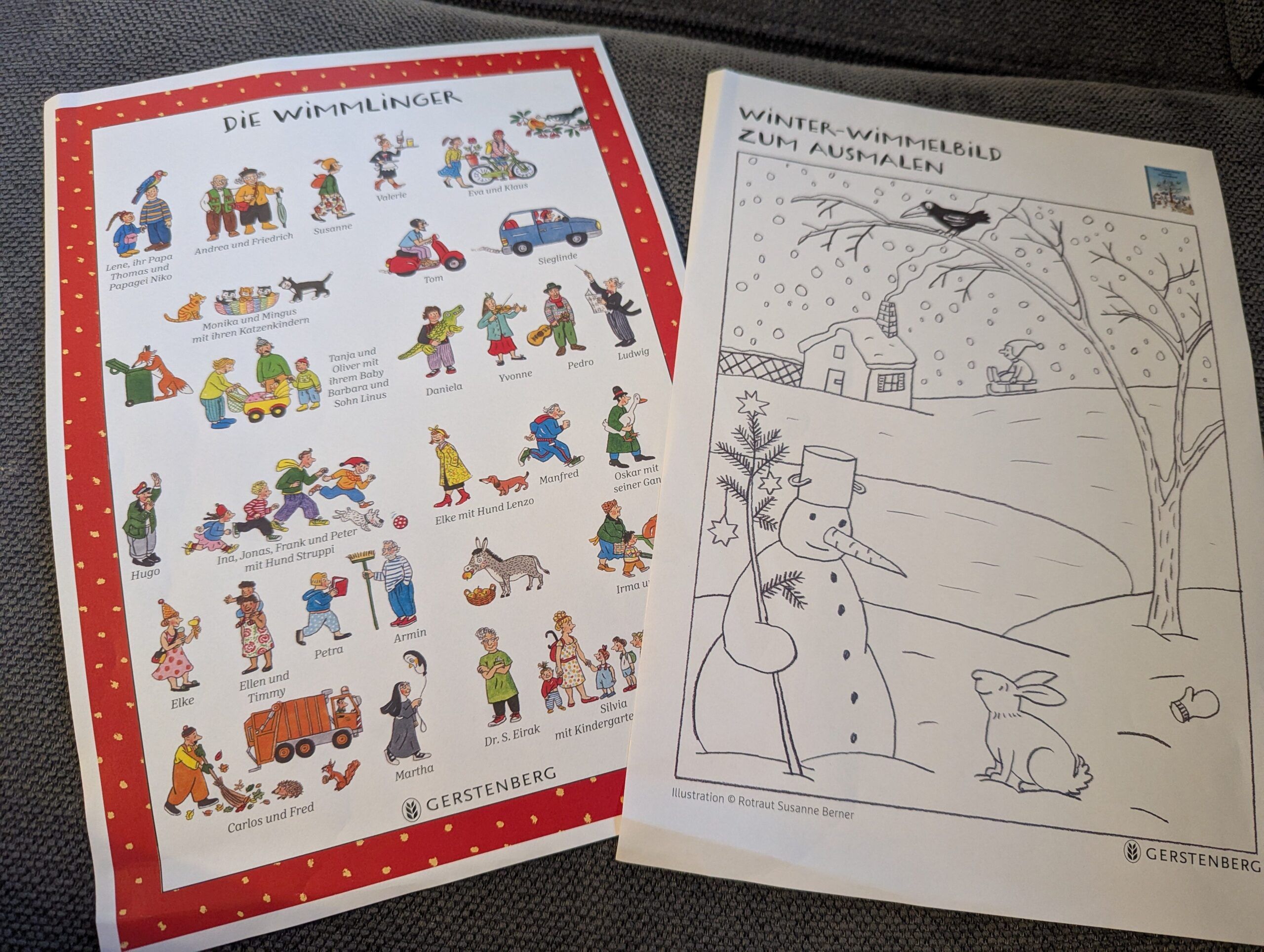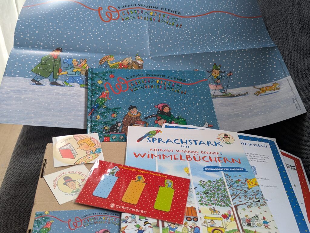Bereits bei der Annahme des Paketes aus dem Gerstenberg- Verlag wurden wir alle von der ersten Vorfreude des Jahres auf den kommenden Advent und Weihnachten durchflutet, als wir das schon von außen so liebevoll gestaltete Paket entgegennahmen, das mit winterlichen Stickern, welche eine Martinsgans, einen Schlitten und einige andere typische Weihnachtsmotive zeigen, geschmückt war. Und beim Auspacken verstärkten sich die Juhurufe, als die Zwillinge sofort ein farbenfrohes Winterplakat aus dem Gerstenbergverlag in den Händen hielten, sowie Aufkleber, eine hübsche Ansichtskarte, Tatoos, Rezepte, ein Ausmalbild und natürlich das Herzstück des winterlichen Überraschungspaket: das ganz aktuell erschienene Wimmelbuch der so beliebten und renommierten Autorin und Illustratorin Rotraut Susanne Berner.