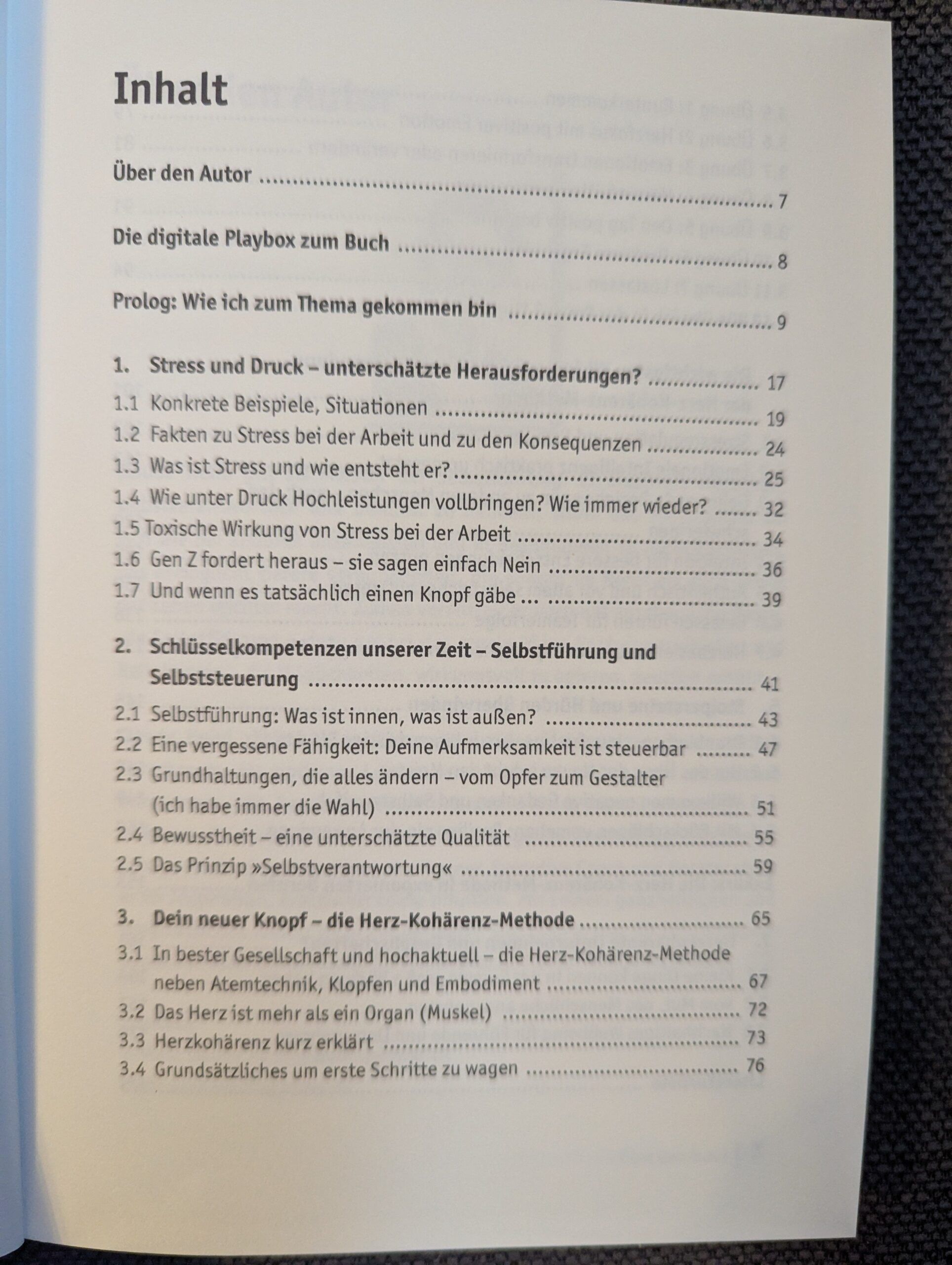 Auf 180 Seiten erläutert der „Meister der Selbstführung“ zunächst anhand von sehr konkreten Szenerien die physiologischen und psychologischen Auswirkungen von lang anhaltendem Stress, preist dann die Selbstführung und den verstärkten Fokus auf die Steuerung der Aufmerksamkeit und die Bewusstheit, bevor er quasi als Wunderumschaltknopf für ein völlig neues Mindset der Leserschaft die Herz-Kohärenz-Methode vorstellt. Diese wird bei weitem nicht nur theoretisch dargestellt, sondern man erhält im Anschluss daran viele einfach umzusetzende und effiziente Übungsbeispiele. Dabei werden einem vielleicht einige Übungen wie die Dankbarkeitsübung aus einem anderen Kontext schon bekannt vorkommen, aber dank dieses Buchs bekommt man gewissermaßen einen ungeheuer großen und vielfältigen Werkzeugkasten präsentiert, in dem man sich hoch effiziente Übungen finden, welche alle miteinander verzahnt am besten wirken.