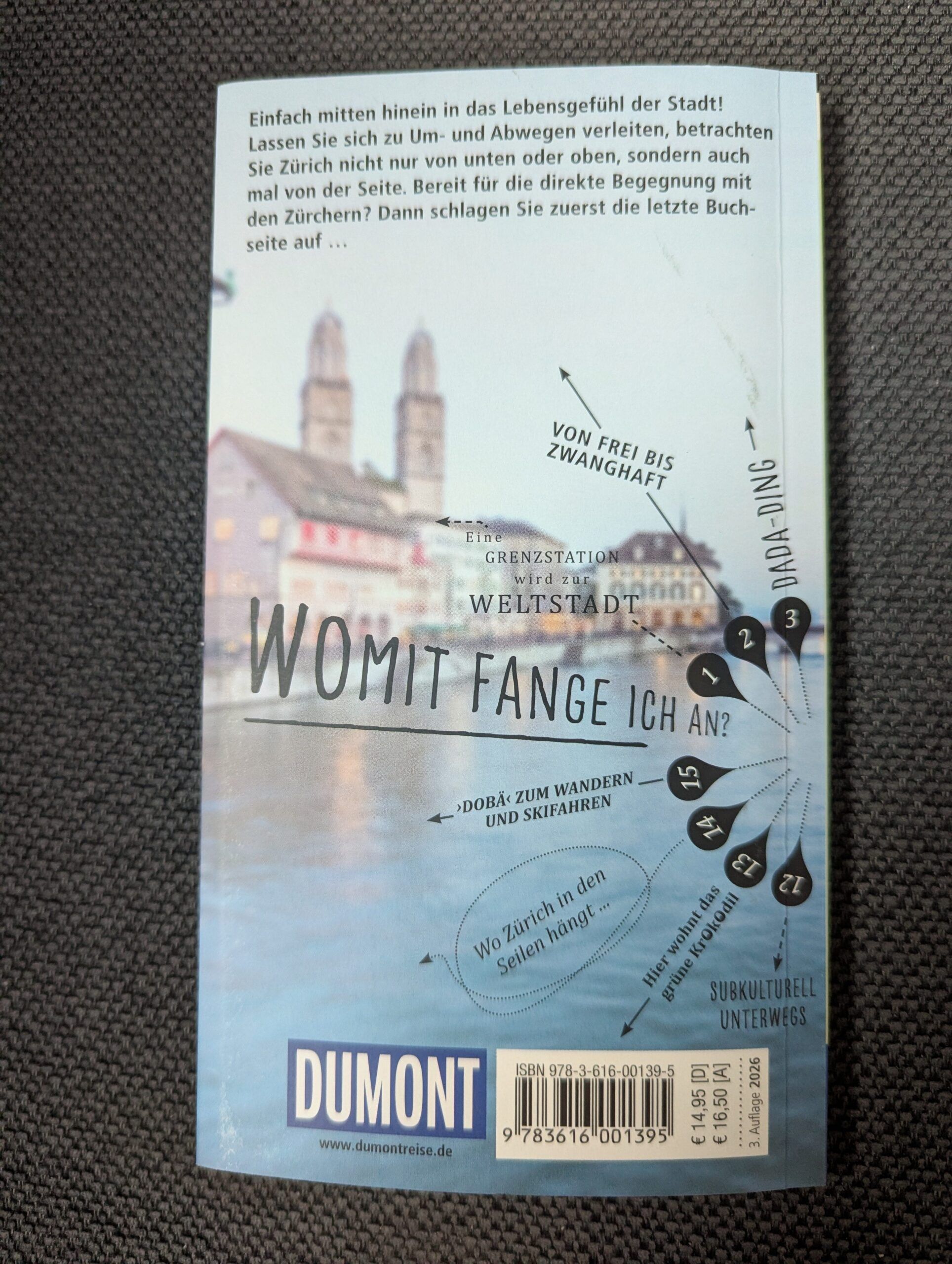 Ein Besuch von Zürich ist immer wieder eine hervorragend Idee und wenn man z.B. von München in die Schweiz reist, bietet sich eine Fahrt mit der Bahn absolut an. Wenn man dann noch in Fahrtrichtung rechts sitzt, erlebt man dabei bereits auf dem Weg eine herrliche Panoramafahrt und genießt das Bodenseepanorama aus der nächsten Nähe zwischen Lindau und Bregenz. Dafür, dass man auch gleich nach der Ankunft in Zürich stets den Überblick behält, sorgt der ganz aktuell im DuMontdirekt-Verlag erschienene Reiseführer Zürich von Gabriele Schwieder, der nun in der bereits dritten aktualisierten Auflage erschienen ist. Die Autorin ist eine gebürtige Zürcherin, welche auch in dieser so besonderen Stadt ihre gesamte Kind- und Jugendzeit verbracht, bevor sie eben dort das Studium von Germanistik und Geschichte aufgenommen hat.