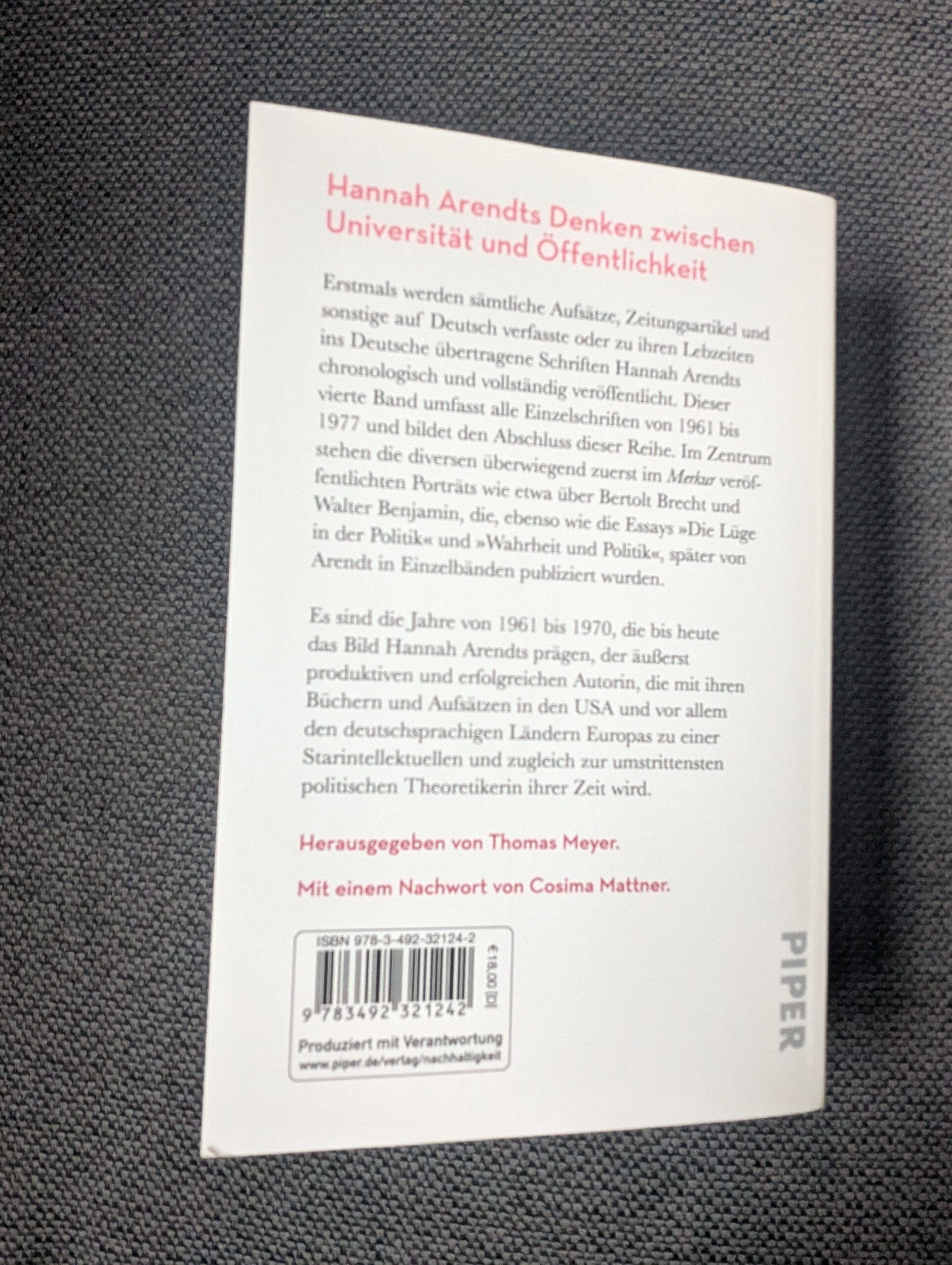 Auch der vierte Band, der im Piper-Verlag erschienen ist, überzeugt dadurch, dass er nicht nur fast immer die Fassung der gesammelten Texte in chronologischer Reihenfolge bietet, die von dieser Ausnahmedenkerin noch selbst überprüft wurden, sondern zudem von äußerst versierten wissenschaftlichen Expertinnen und Experten unter von ihnen selbst gewählten Schwerpunkten erklärt werden.