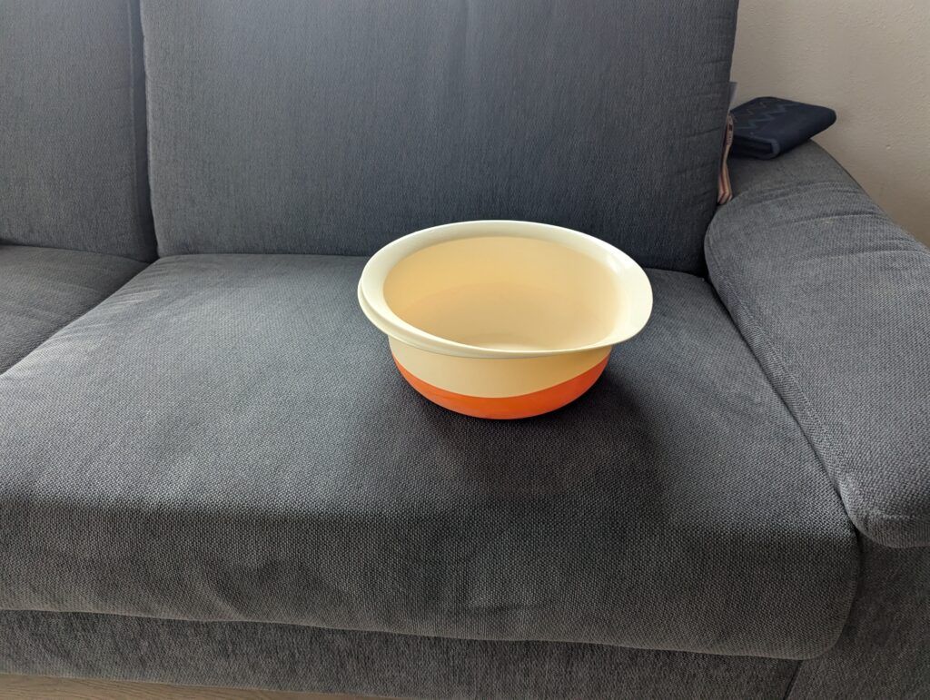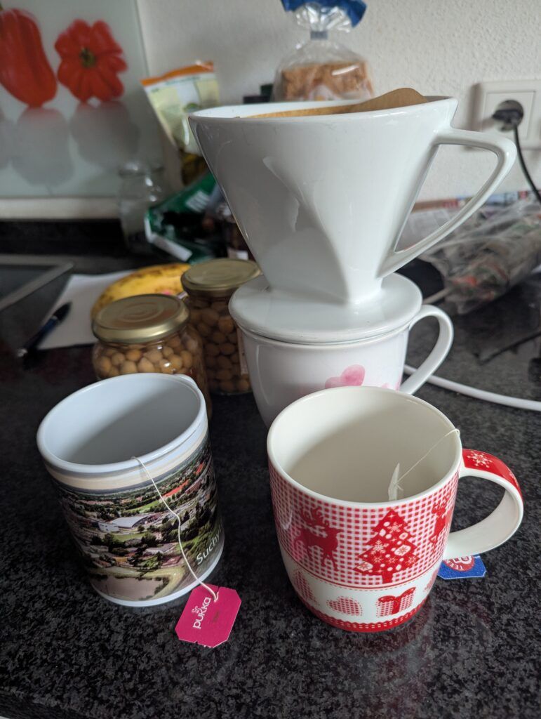 Sehr lange konnte ich sowieso nicht am Platz sitzen bleiben, wurde selbstverständlich auch an diesem Tag nicht nur nicht mir geholfen, meinen Kaffee oder ähnliches unfallfrei an meinen Platz zu bringen – gestaltet es sich doch nach wie vor nicht immer ganz komplikationsfrei, mit dem kaputten Fuß in der Luft und dem linken Knie auf dem Orthoscoot kniend, diesen schwerfällig durch unsere schmale Küche und den engen Flur zum Wohnzimmer zu lenken, während ich in der anderen Hand z.B. einen kochend heißen Topf oder aber auch eben meinen geliebten Kaffee zu transportieren versuche-, keimte doch der Wunsch bei der Jugend nach einem Kamillentee nach der so ungesund verbrachten Nacht auf. Auch, wenn ich selbst sehr gerne mal nach dieser so schweren Fußoperation bemuttert werden hätte wollen, setzte ich selbstverständlich das Teewasser für die beiden Alkoholgeschädigten auf und holte die gerade verräumte Spuckschüssel zur Sicherheit wieder hervor, dieses Mal für den männlichen Part.