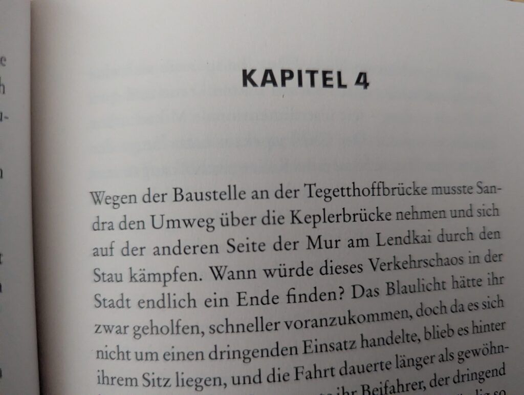 Jedenfalls liest sich auch diese Neuerscheinung ausgesprochen leicht und flüssig. Er ist in einer klaren Sprache mit vielen kurzen Sätzen und lebendigen Dialogen geschrieben und lässt bei der Leserschaft unverzüglich die einzelnen Szenen bildhaft vor dem geistigen Auge entstehen, so als hätte man den gesamten Fernsehkrimi vor sich. Die Autorin schickt einen raffiniert immer wieder auf neue Ermittlungsspuren, so dass die Lektüre tatsächlich auf keiner einzigen Seite langweilig wird. Zudem ist die Handlung sehr im aktuellen Zeitgeschehen verwurzelt, wenn z.B. auch die KI von den Ermittlern bezüglich des Tatmotivs herangezogen wird.
