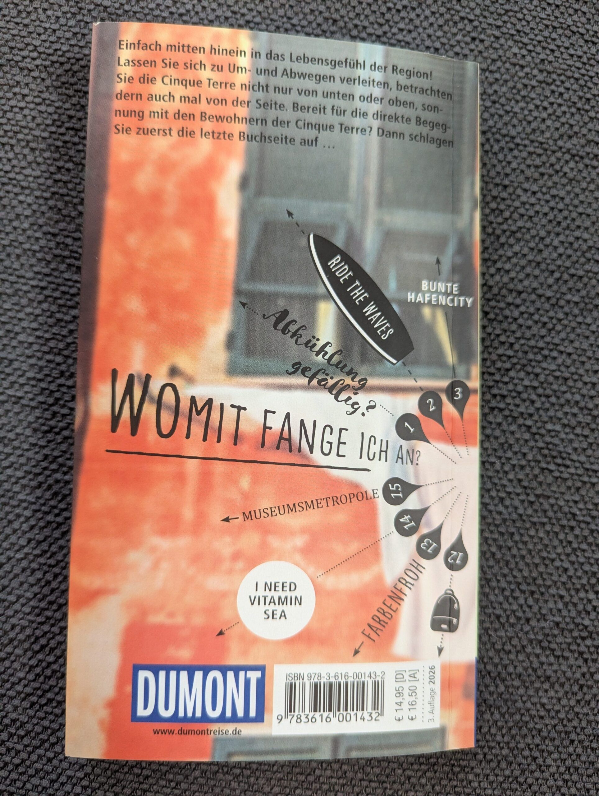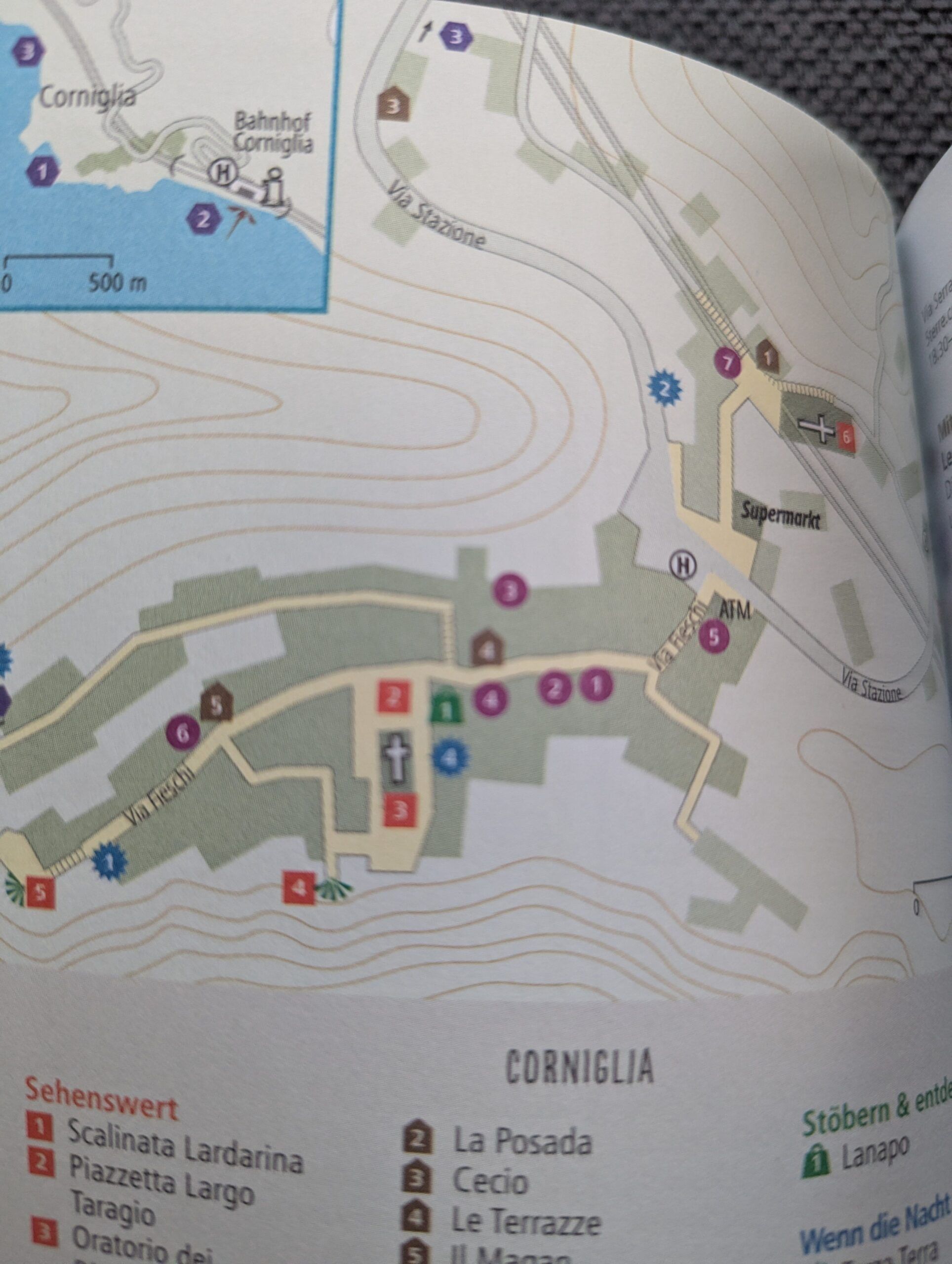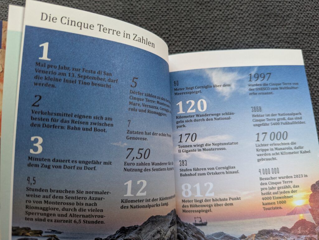 Wie gerne hätten wir einige Orte vor drei Jahren im Sommer auch besucht, als wir einen Tag in La Spezia verbrachten. Leider war dies jedoch just an diesem Tag nicht möglich, hatten doch die Bürgermeister von allen fünf pittoresken Orten aus Sicherheitsgründen wegen sintflutartiger Regenfälle einen Besuch derselbigen untersagt. So bleibt nur die Hoffnung, dass wir es ganz bald in einem neuen Anlauf schaffen werden und dieses Mal, absolut bestens für alle Erkundungen mit dem vorliegenden Werk ausgestattet sind. Dank der Übersichtskarte, welche man wie immer ganz vorne im Buch findet, bekommt man sofort einen Überblick, wo die vorgestellten Orte lokalisiert sind und erkennt auch unverzüglich, wie nah sich davon die Hafenstadt Genua befindet, der in diesem Buch auch ein eigener Ausflug gewidmet ist.
