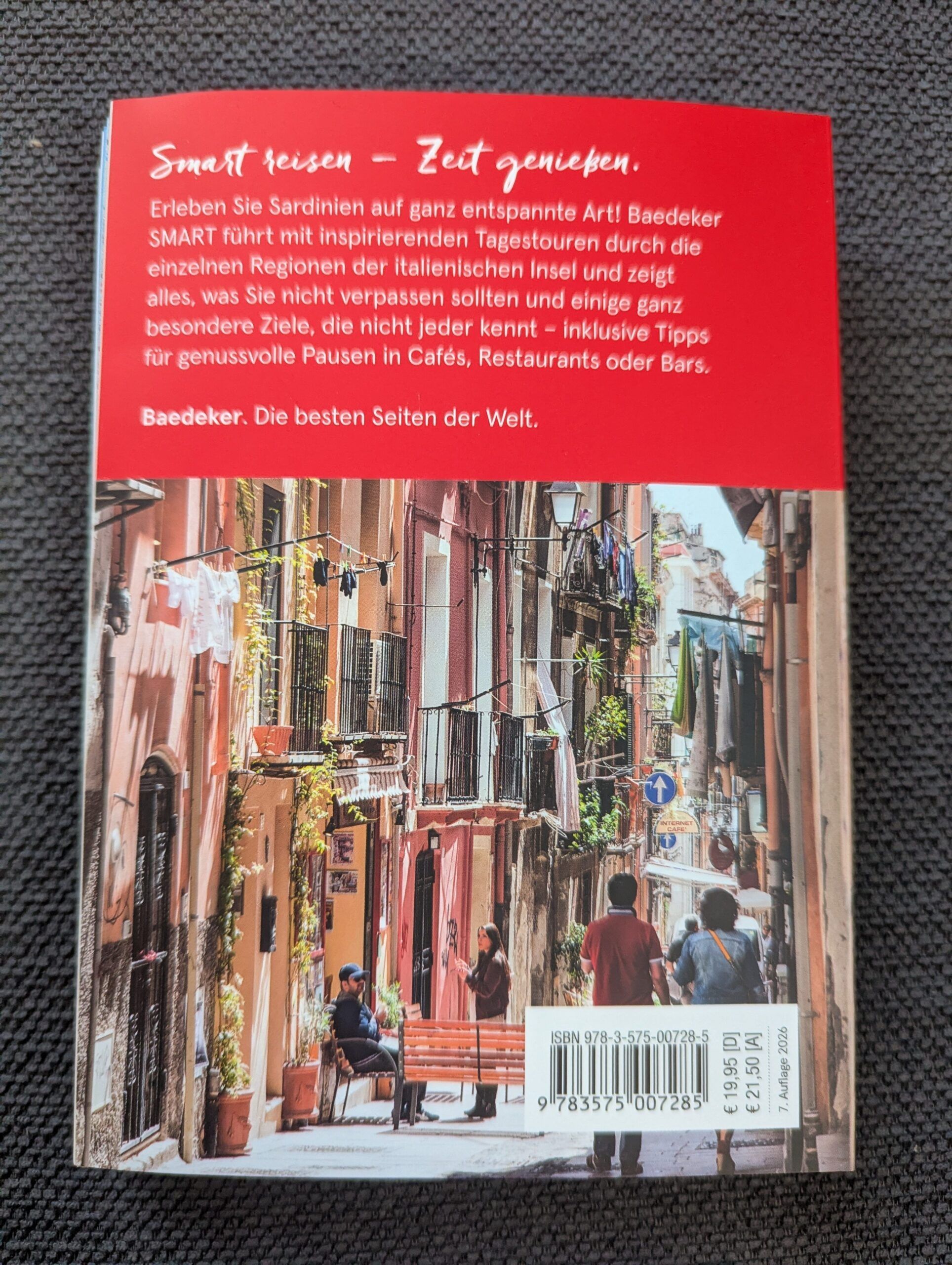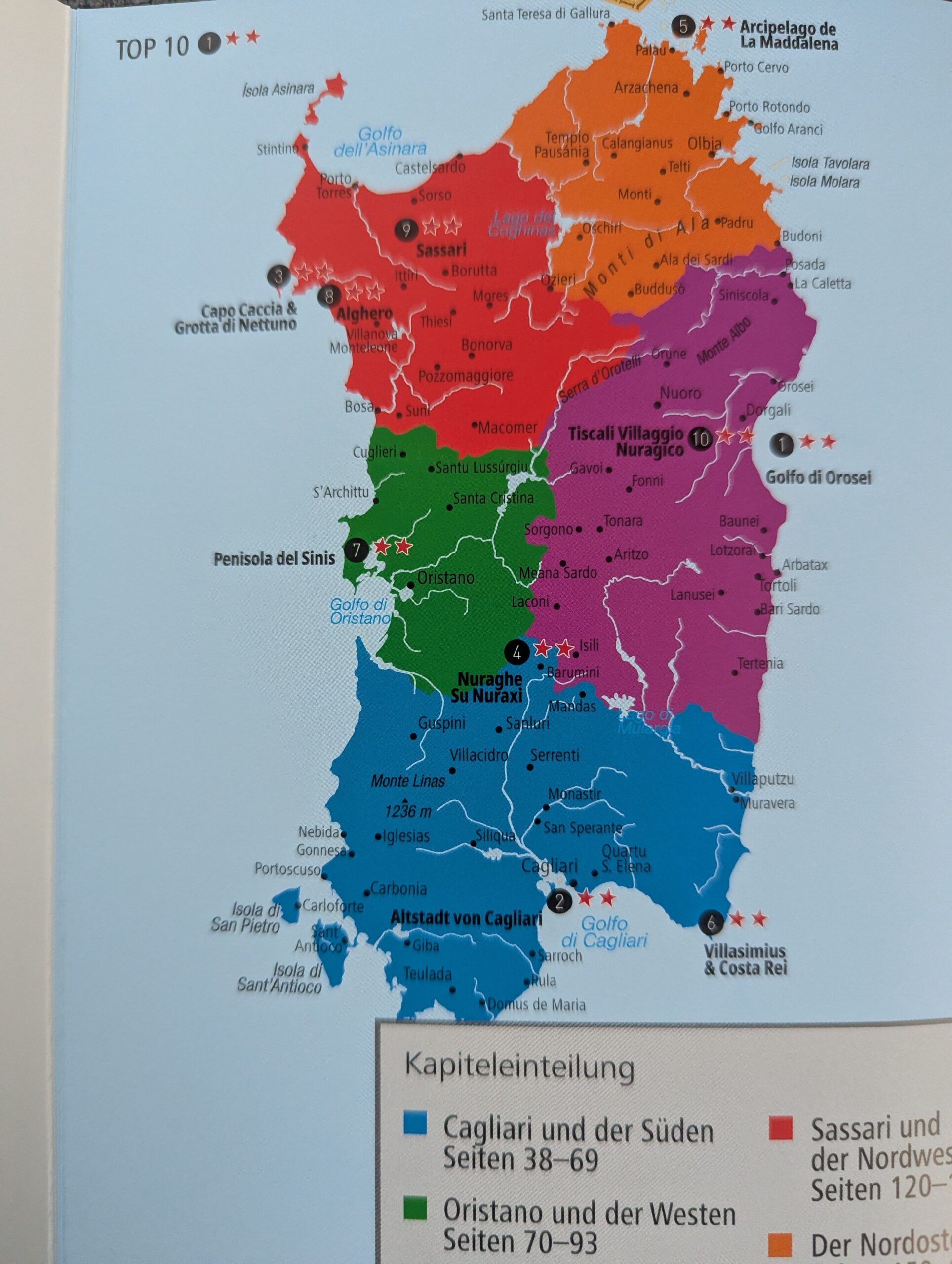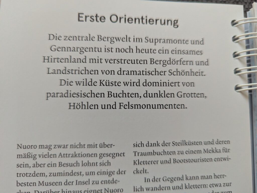 Alle Bücher der Reiseführerreihe des Baedeker Smart erfreuen bereits beim ersten Durchblättern jede/n, verblättert sich doch dank der so benutzerfreundlichen Spiralbuchbindung keine einzige Seite. Dies ist selbstverständlich auch bei dem ganz aktuell erschienenen Band über Sardinien der Fall, der nun bereits in der siebten Auflage erschienen ist. Der Reiseführer behandelt folgende fünf Regionen von Sardinien: Cagliari und der Süden, Oristano und der Westen, Nuoro und der Osten, Sassari und der Nordwesten sowie den Nordosten. Dabei stechen einem in jedem Kapitel sofort die Baedeker Topziele ins Auge, welche mit roten Sternen gekennzeichnet sind. Zudem sind alle Kapitel für eine optimale Übersichtlichkeit stets gleich aufgeteilt.