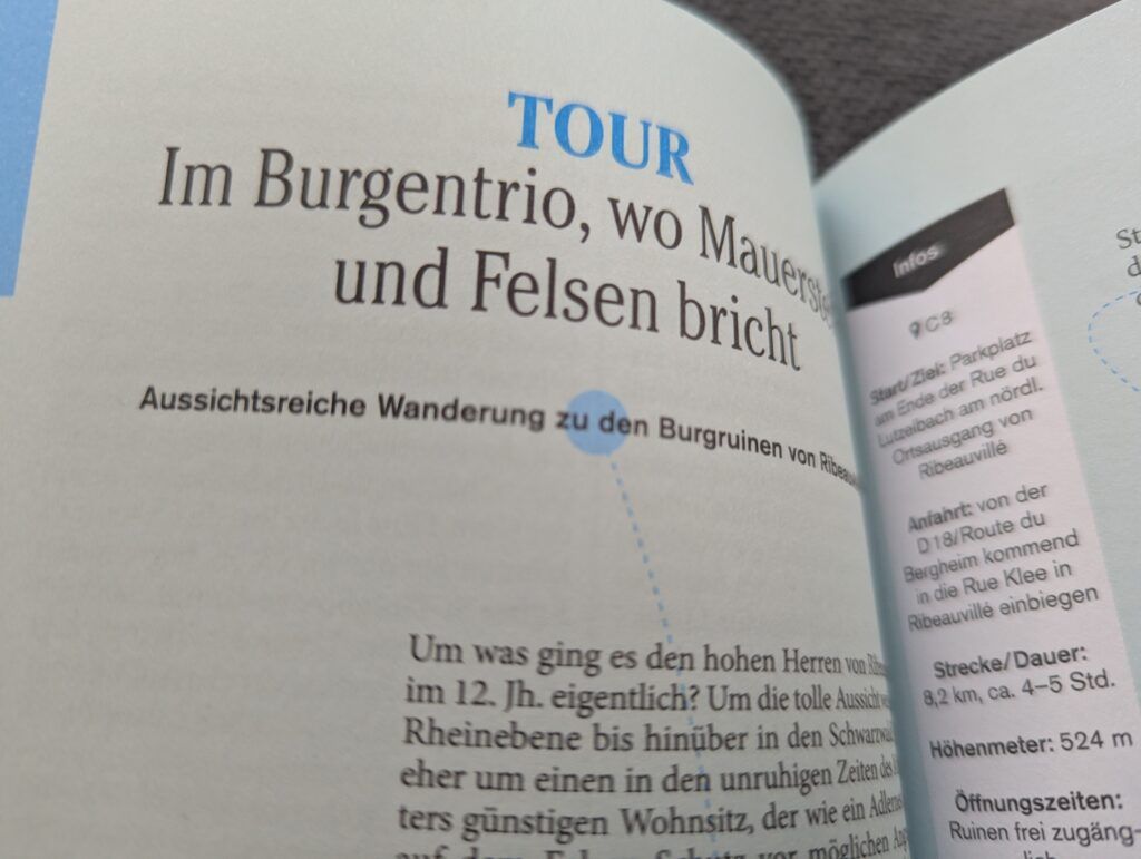 So gibt es neben bestens recherchierten Tourenvorschlägen und vielen Hintergrundinformationen zu den einzelnen Sehenswürdigkeiten auch immer wieder ganz besondere Highlights, sei es in Form einer Kneipentour in einem der beliebtesten Viertel Straßburgs, einer höchst reizvollen und malerischen Radtour entlang eines Kanals oder auch einer Street-Art-Tour. Außerdem bekommt man durch die Kategorie „Lieblingsort“ wahrhaftige Geheimtipps, wie z.B. wie eine unvergleichbare Imbissbude, welche nicht nur leckeres französisches Essen anbietet, sondern über einen phänomenalen Ausblick verfügt, den Besuch einer Markthalle, welche keines einzigen kulinarischen Leckerbissen entbehrt oder aber auch des Rätsels Lösung einer ganz speziellen Kirchenmauer.