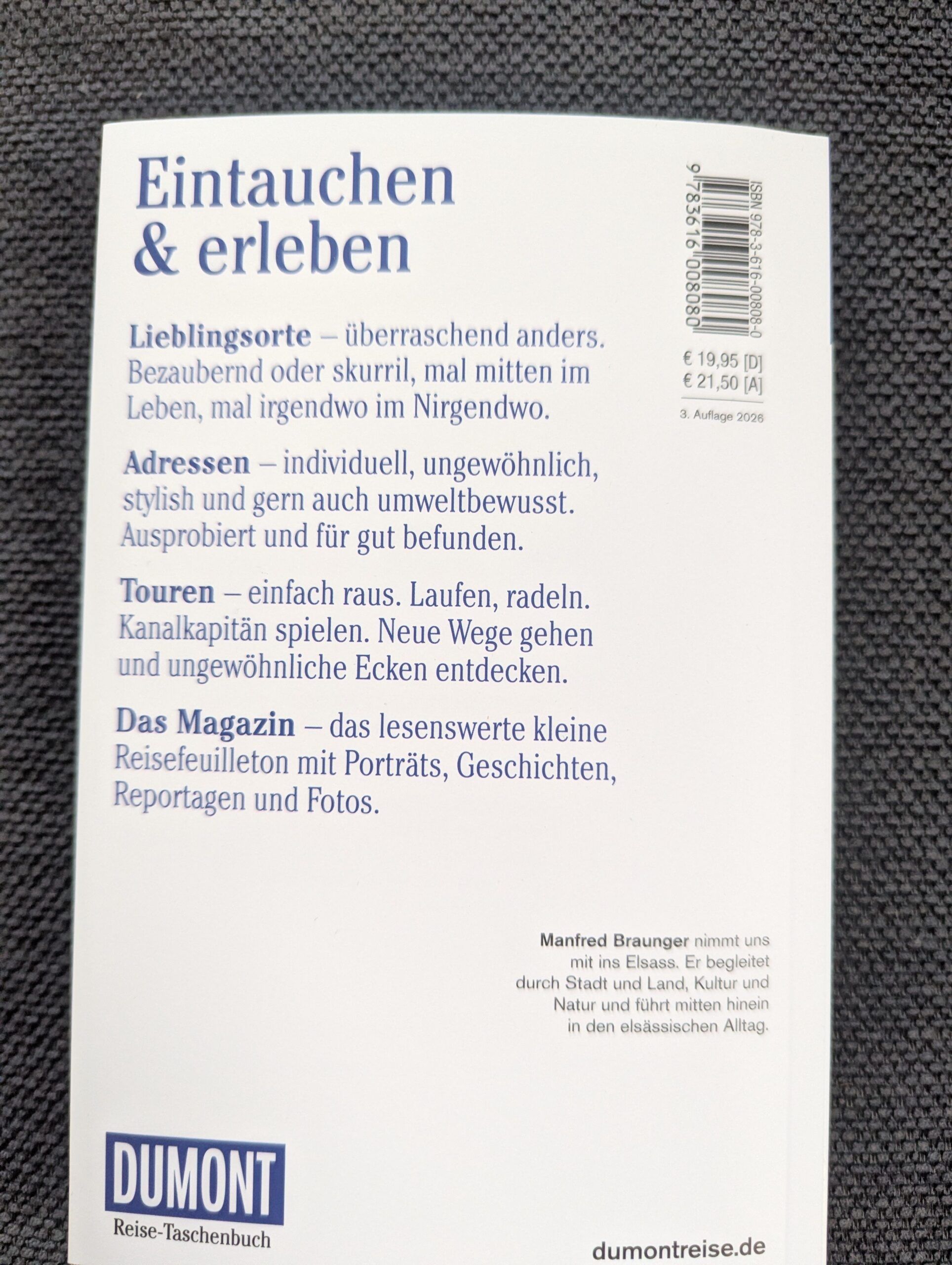Ich hatte mich im letzten Jahr schon so sehr auf unsere Reise mit der Selbsthilfegruppe von meiner Elterngruppe mit Typ 1-Diabetikerkindern gefreut, welche nun aufgrund meiner höchst komplizierten und leider noch überhaupt nicht erfolgreich abgeschlossenen Fuß-OP schweren Herzens abgesagt werden musste. Auch wenn ein Reisen momentan noch in keiner Weise absehbar ist, wird mit Sicherheit, wann immer es wieder möglich ist, eines der ersten Ziele ein Besuch im Elsass sein. Dafür, dass uns dort nicht auch nur das Geringste entgeht, wird der ganz aktuell im Dumont-Verlag, bereits in der dritten Auflage, erschienene Reiseführer über die gesamte Region des Elsass bestens sorgen.