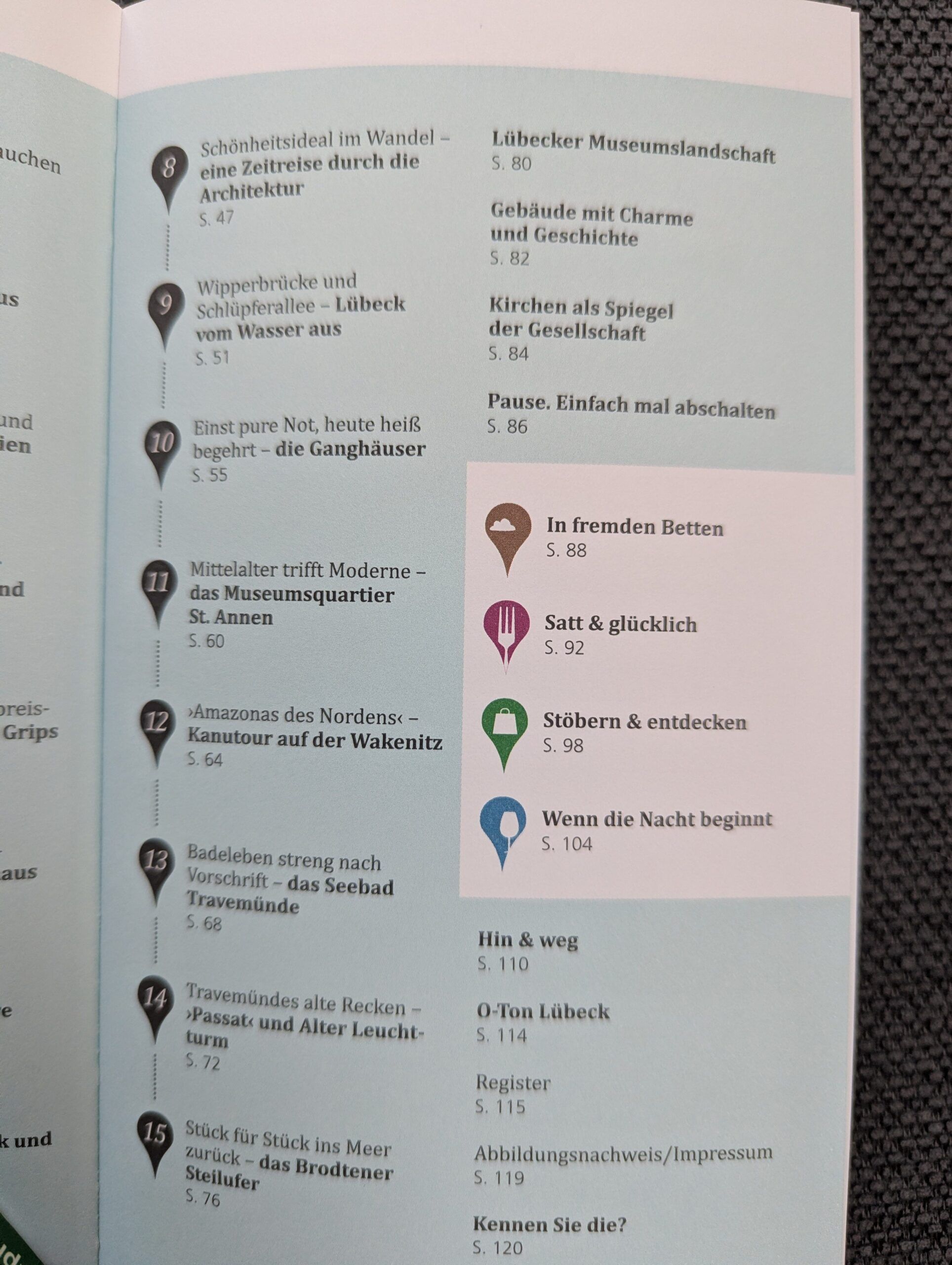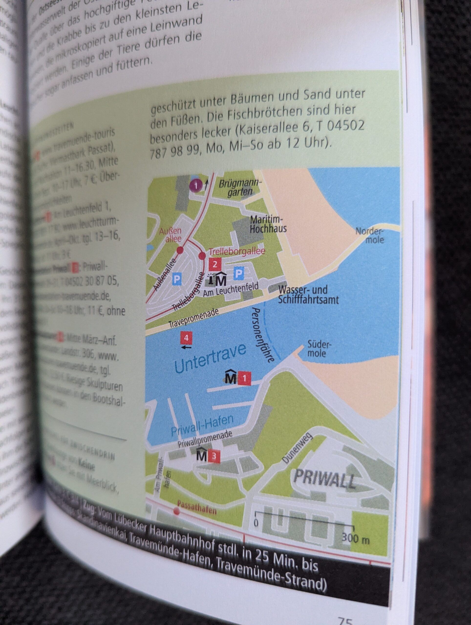 Und für alle, welche einen „echten“ Urlaub mit dem Besuch am Meer zwingend verbinden, findet man selbstverständlich auch einige Tourenvorschläge rund um das Seebad Travemünde. Alle 15 Unternehmungsvorschläge sind mit sehr ansprechenden Aufnahmen bebildert und mit vielen reisepraktischen Informationen und jeweils auch den passenden Kartenausschnitten versehen. Und dank des hinteren Buchteils findet man sowohl reizvolle Übernachtungsmöglichkeiten für jedes Geldbeutelvolumen als auch ganz besondere Restaurants- oder Shoppingtipps. Fehlen darf selbstverständlich auch nicht die sehr beliebte Kategorie „Kennen Sie die?“ auf der letzten Seite des Werkes, in der man z.B. erfährt, dass der bekannte Journalist und Autor Bastian Sick wie auch der renommierte Schauspieler Horst Frank aus Lübeck stammen.