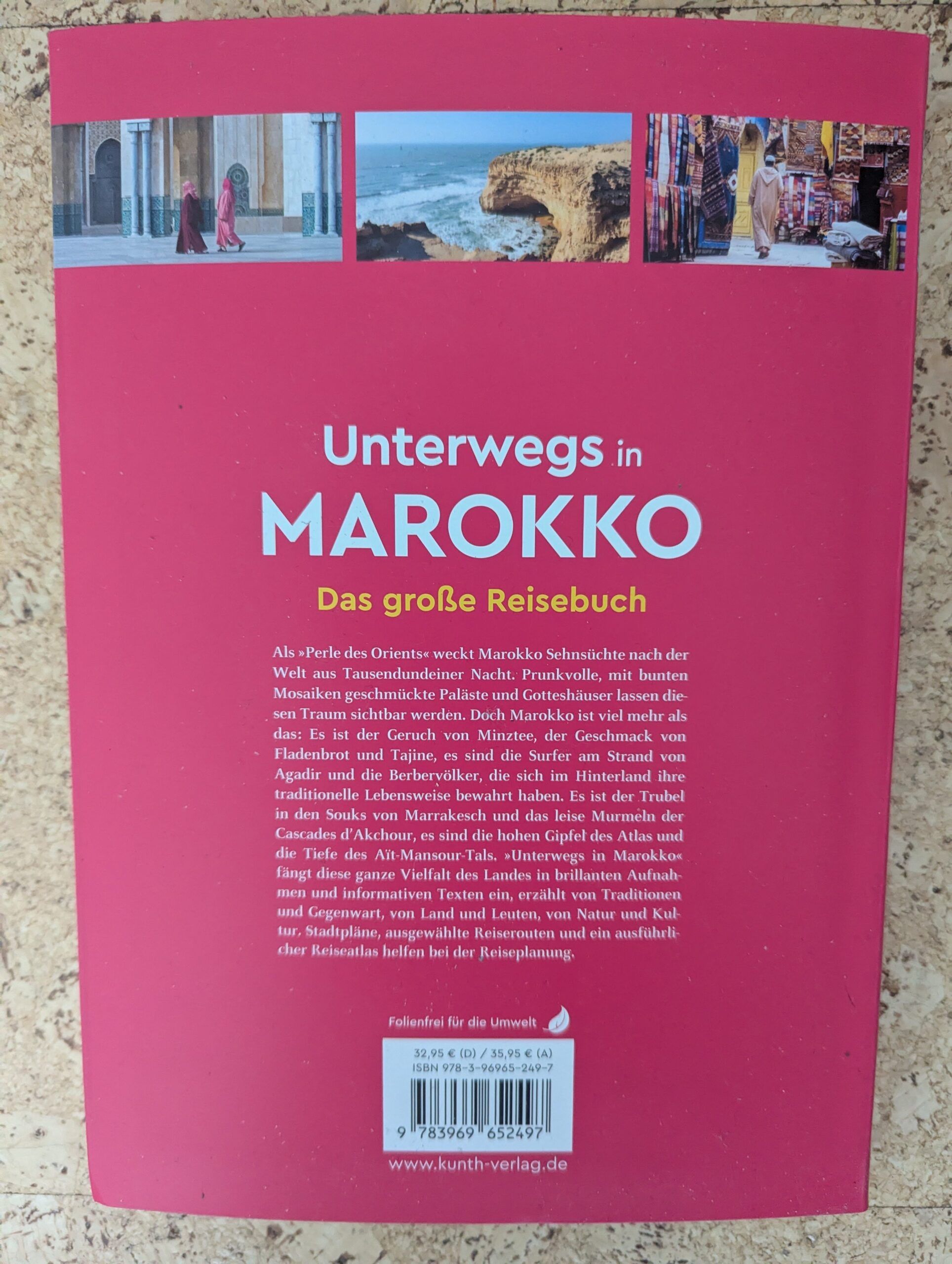 Marokko steht als Sehnsuchtsziel schon seit einigen Jahren ganz weit oben auf meiner Wunschreisezielliste. Leider habe ich es aus den unterschiedlichsten Gründen bis jetzt noch kein einziges Mal auf einen anderen Kontinent geschafft. Nun ist jedoch immerhin ganz aktuell im Kunth Verlag aus der so beliebten Reihe „Unterwegs in….“ das große Reisebuch über Marokko erschienen, das allein schon von den zahlreichen Fotoaufnahmen ein Eintauchen in magische Welten verspricht. Auch dieser Band ist eine überaus gelungene Mischung aus einem höchst informativen Reiseführer und einem Bildband, welcher schon beim ersten Durchblättern Urlaubsfeeling pur vermittelt.