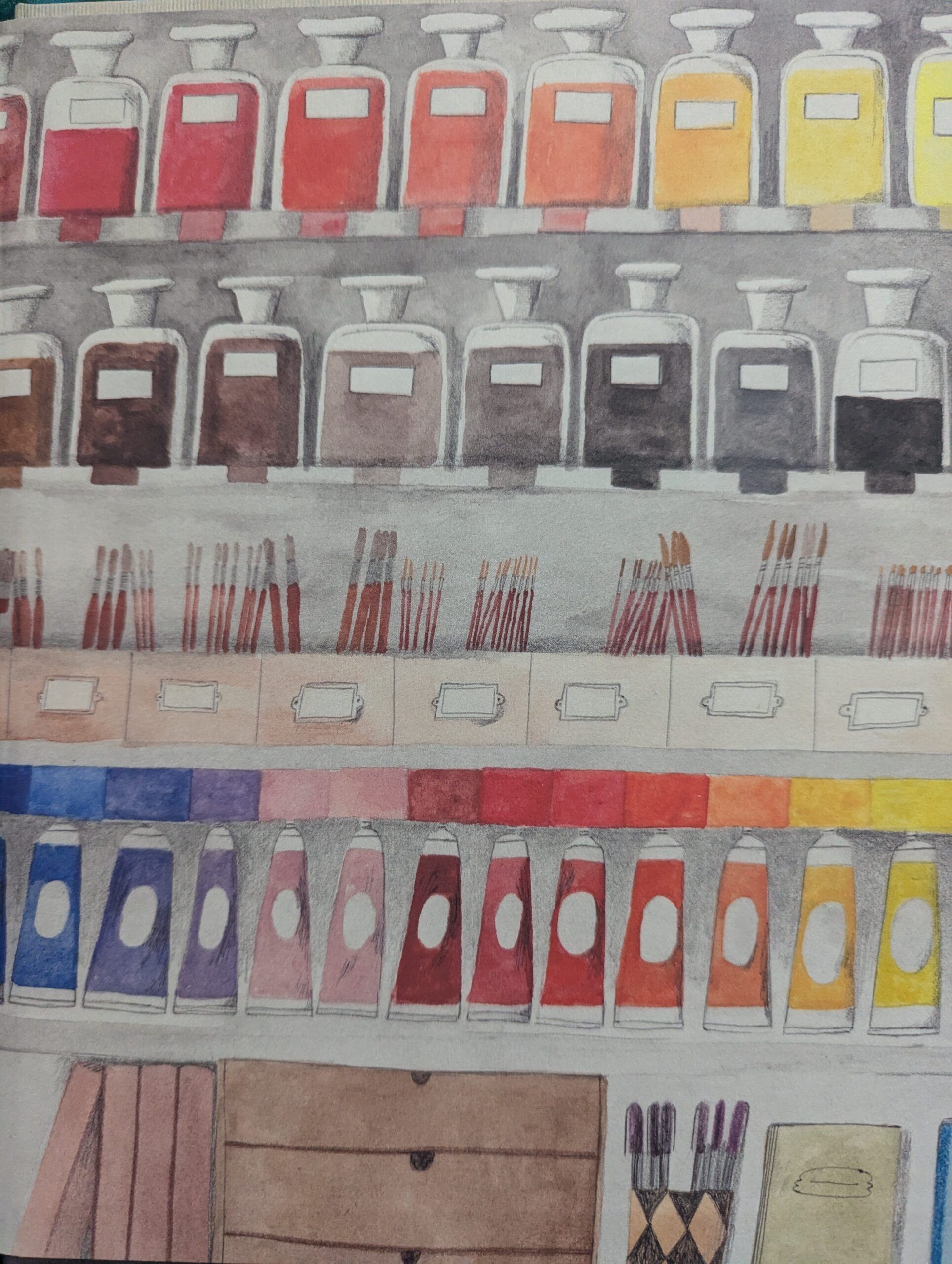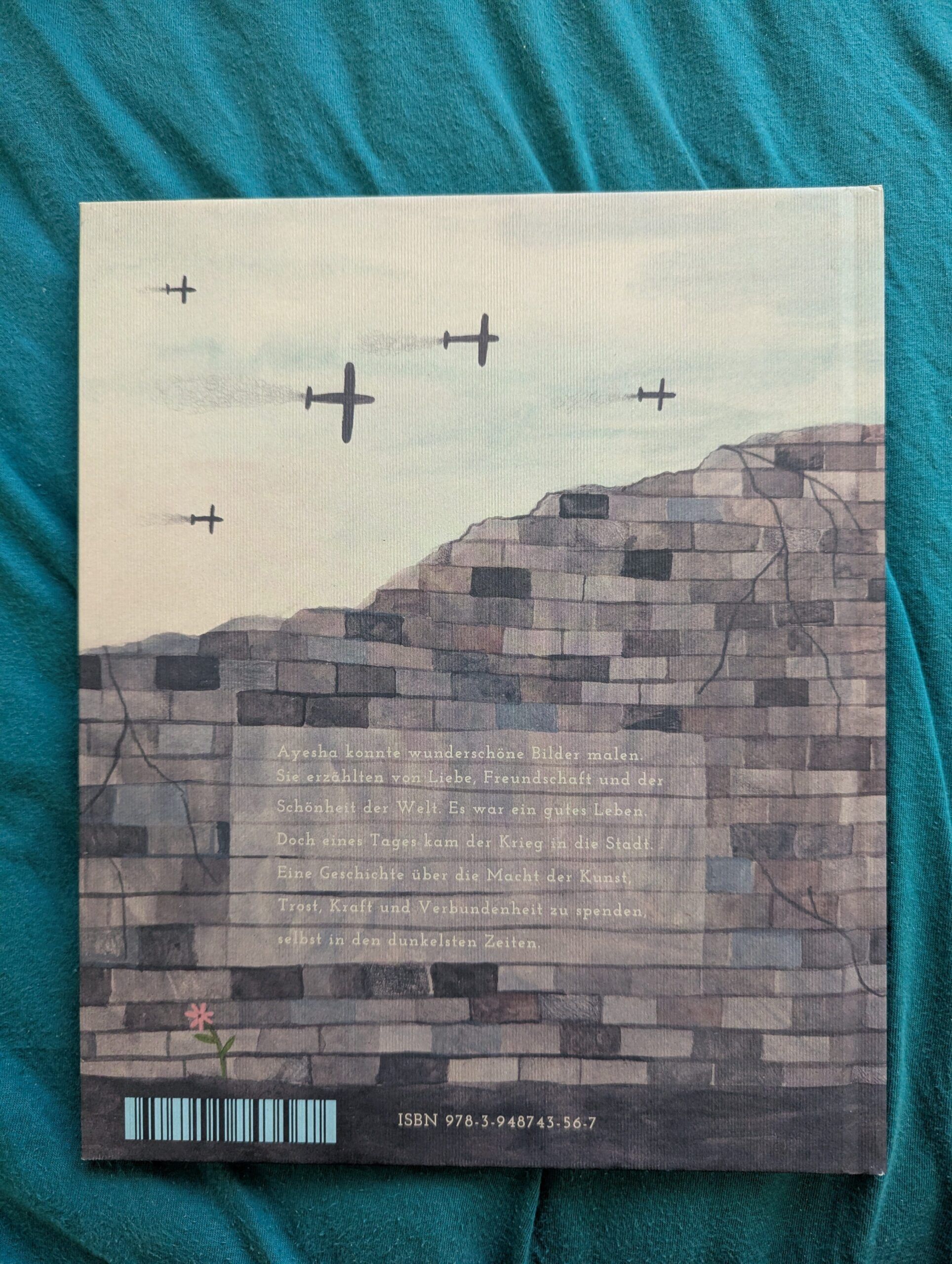 Bereits der Titel lässt erahnen, dass die Protagonistin dieses Kinderbuchs wohl aus einem anderen Land stammen wird. Und auf den ersten Seiten lernt man diese äußerst sympathische Künstlerin kennen, von der man erfährt, dass sie eine sehr begabte Künstlerin ist und wunderschöne Bilder malt, welche auch öfters in Museen ausgestellt wurden. Die Zeichnungen sind auf jeder Doppelseite ausgesprochen farbenprächtig und ansprechend gestaltet und regen zum Gespräch mit den Kindern beim jeweiligen Vorlesen bestens an. Bereits die Kindergartenkinder werden bei dem Betrachten des Buches allein durch den plötzlichen Farbwechsel von den leuchtend bunten Farben in die tristen, dunklen und bedrückenden Farben sofort erkennen, dass etwas Schlimmes in dem Leben von Ayesha, aber auch all ihren Mitmenschen geschehen ist in Form eines Krieges. der mi dem Abwurf von Bomben in ihrer Nachbarstadt begonnen hat.