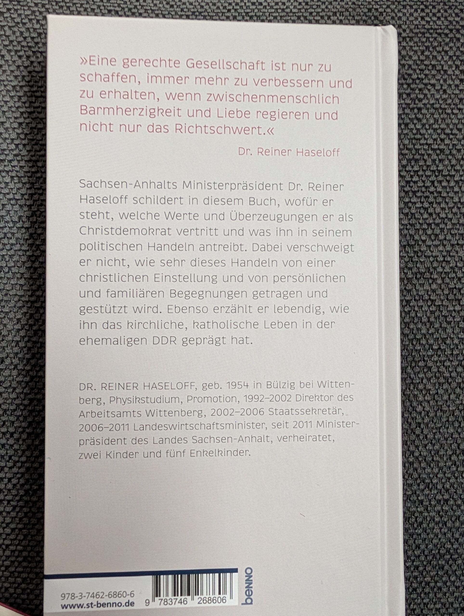 Dass Politiker und Politikerinnen ihre Memoiren am Ende oder während ihrer Amtsperiode(n) mehr oder weniger fesselnde Memoiren schreiben, ist kein Unikum. Dass ein bedeutender Politiker seinen christlichen Glauben und die aktive Politikgestaltung miteinander verbindet und davon beeindruckend schreibt, ist schon deutlich seltener. Und deshalb ist es wunderbar, dass nun ganz aktuell im Benno-Verlag das Werk von Sachsen-Anhalts Ministerpräsident Reiner Haseloff „Christliche Werte leben – Politik gestalten“ erschienen ist. Bereits seine so langjährige Amtszeit von aktuell bereits 15 Jahren beweist sein großes Durchhaltevermögen und ein sehr diszipliniertes Regieren.