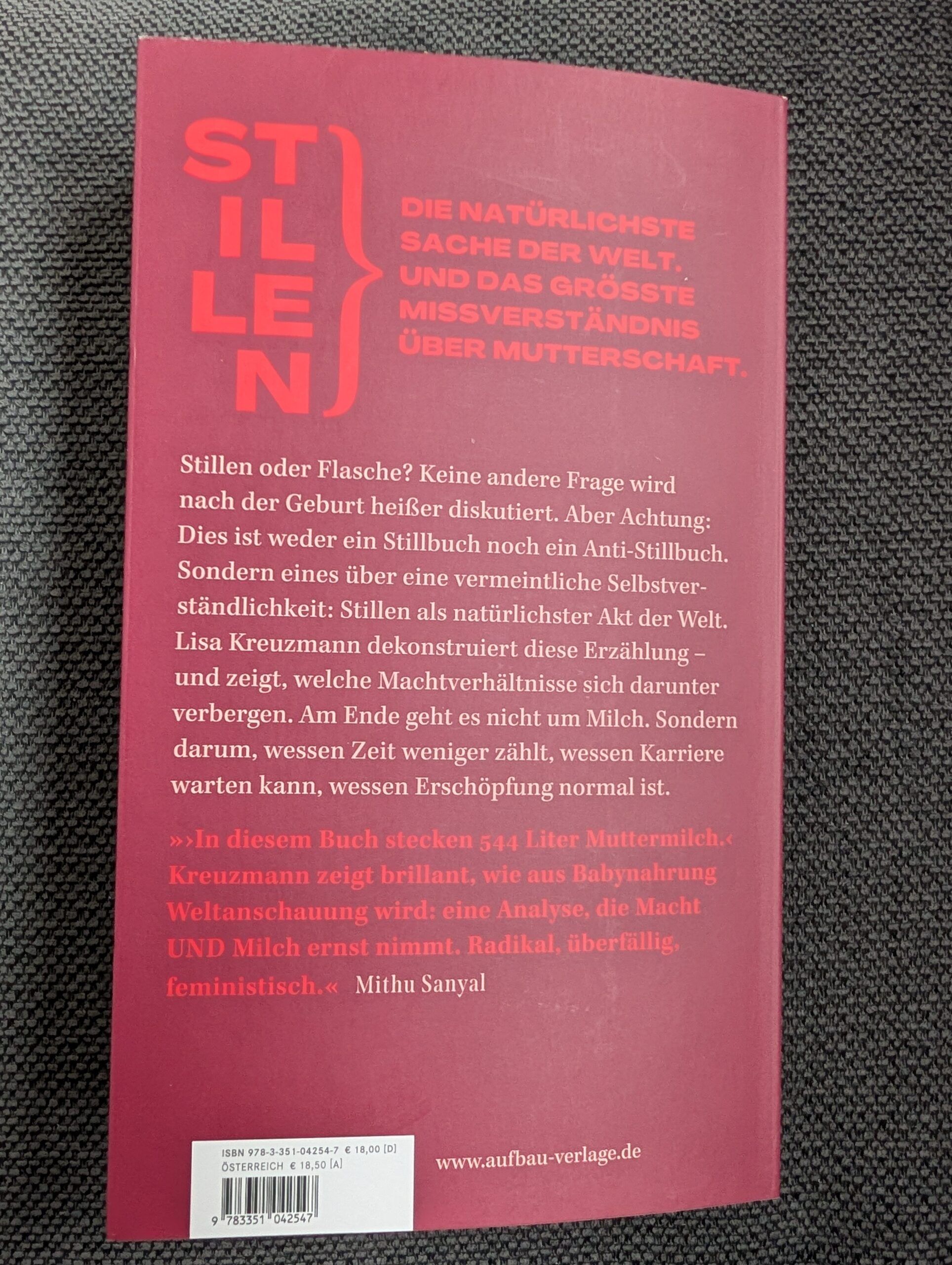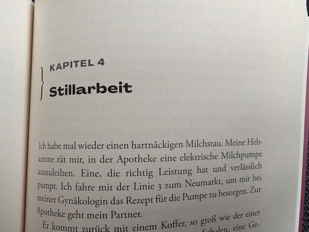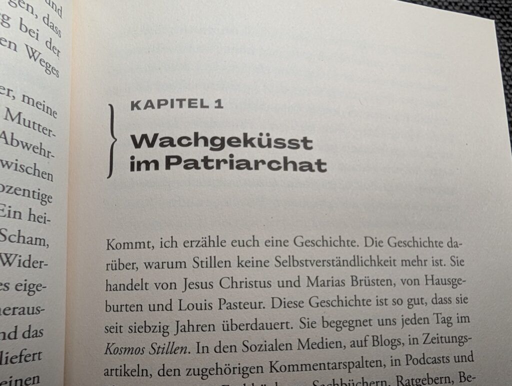 Nun ist ganz aktuell im Aufbau-Verlag von der studierten Sozialwissenschaftlerin, Journalistin und zweifachen Mutter Lisa Kreuzmann dieses Buch erschienen, das ganz deutlich kein Pro- oder Kontra-Buch bezüglich des Stillens darstellt, sondern aufzeigt, welche erschreckenden Machtverhältnisse sich hinter dem Stillkonstrukt verbergen. Auf über 300 Seiten liest man in fünf großen Überkapiteln alles rund um die verschiedensten Aspekte des Stillens, von relativen Allgemeinplätzen wie z.B., dass viele moderne Mütter das Stillen verlernt haben über Definitionen einer Mutter und Ansichten einer Feministin bis hin zu Betrachtungsweisen und Erörterungen mit der Fragestellung, ob Stillen als wirklich Arbeit gerechnet werden kann. Das Buch mündet in einer radikalen Neubetrachtung. Insgesamt ist dieses Buch sehr flüssig und leicht verständlich geschrieben, bietet jedoch zugleich im Anhang zu jedem einzelnen Kapitel ein ausführliches Literaturverzeichnis an.