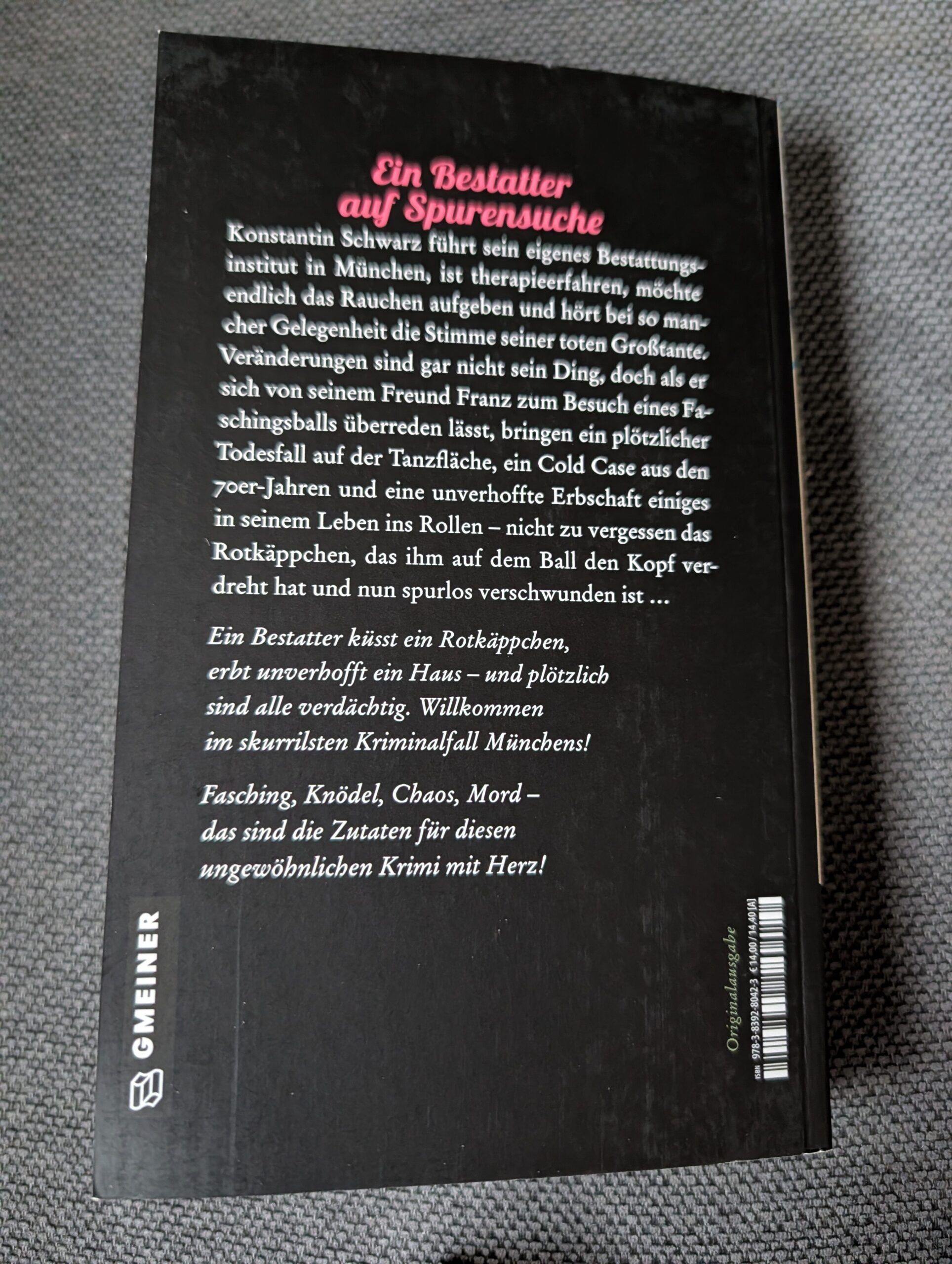 Das Buchcover dieses ganz aktuell im Gmeiner-Verlag erschienenen Krimis erinnert mich ein wenig an die (in meinen Augen mittlerweile schon ziemlich ausgelutschten) Eberhoferkrimis von Rita Falk. Umso erfreulicher ist es, dass das Krimigeschehen, das die passionierte Autorin und Schwäbin mit bajuwarischen Wurzeln in dem „Knödelmord im Sperrbezirk“ entwirft, nicht nur mir als Münchnerin gleich ausgesprochen von der Lokalität sympathisch ist, sondern dass die Handlung äußerst flüssig und leicht zu lesen ist. Die Autorin lässt einen ungewöhnlichen Charakter in Form des Bestatters Konstantin Schwarz ungeahnte Veränderungen im Leben erfahren, wie eine völlig unverhoffte Erbschaft eines stattlichen Hauses oder auch ein Hals-über-Kopf-Verlieben in eine als Rotkäppchen verkleidete Dame auf einem Faschingsball in München, bei dem ein plötzlicher Todesfall alles überschattet.