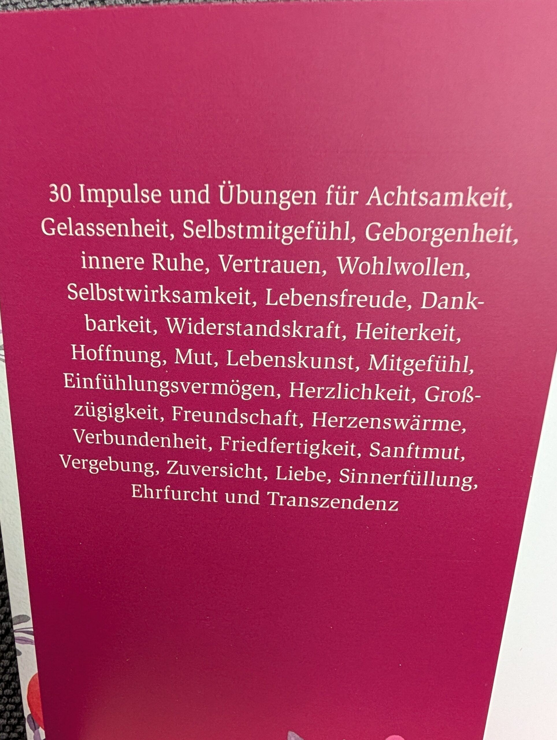 Die erfahrene Berliner Autorin und Referentin gibt in diesem sehr handlichen und wunderschön gefertigtem Büchlein ihren großen Erfahrungsschatz, den sie bereits in vielen Publikationen und Seminaren vermittelt hat, nun auch an alle Leserinnen und Leser dieses Buches weiter. Zudem punktet es mit der Präsentation von Meditationen und man findet immer wieder ausgesprochen passende Zitate von lebenden und bereits verstorbenen Persönlichkeiten, die jeden der 30 Impulse oder auch die Übungen für Achtsamkeit, Gelassenheit, Vergebung und viele weitere Themen höchst treffend einleiten.
