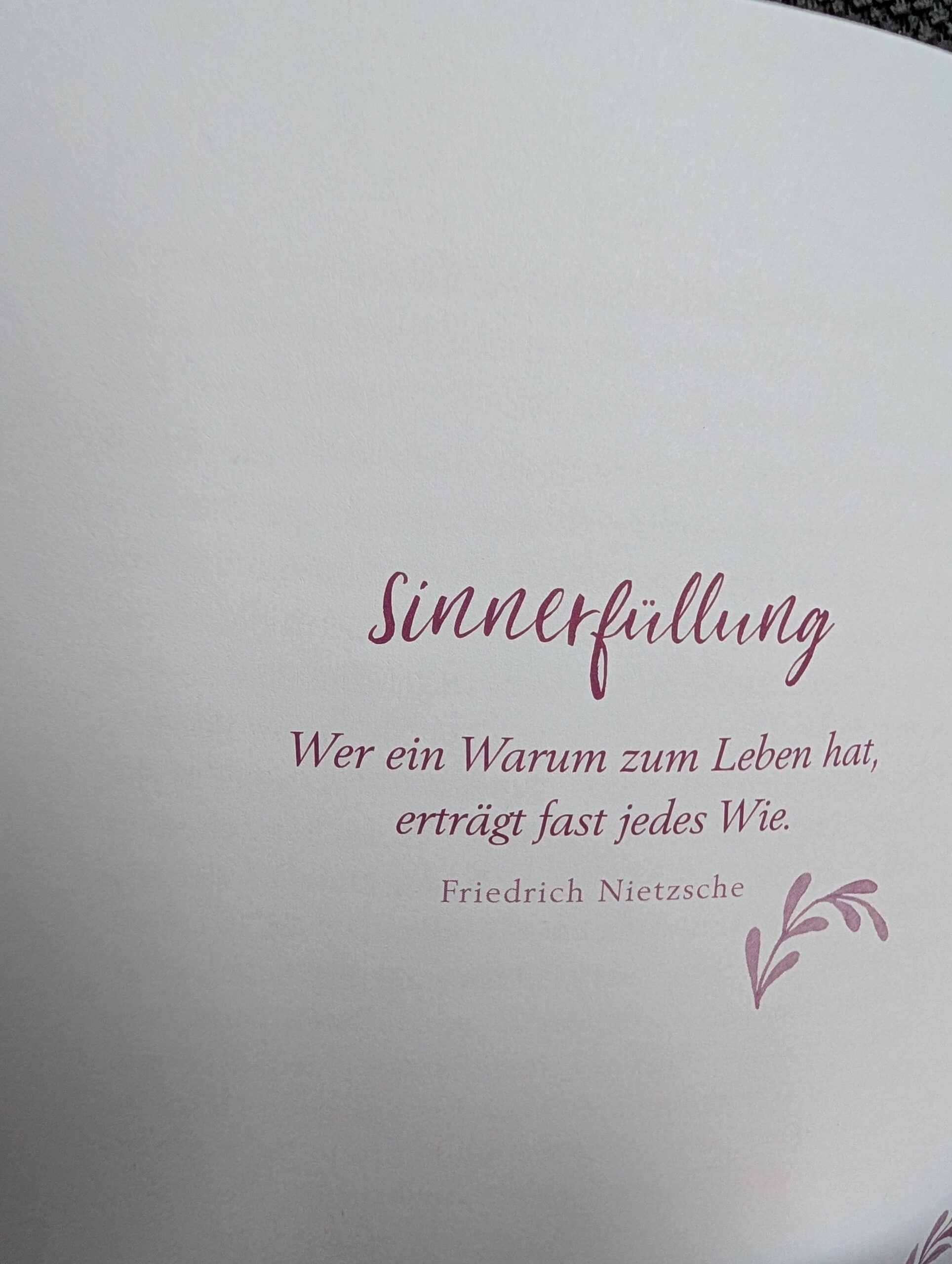 Dank dieses Büchleins gelingen auch Selbstreflexionen durch angeleitete Fragen hervorragend, so dass man eine große tägliche Hilfestellung bekommt, um z.B. mit mehr Gelassenheit oder auch mehr Lebensfreude durch das Leben zu schreiten. Das Werk eignet sich selbstverständlich auch bestens zum Verschenken, um allen Herzensmenschen eine große Freude zu bereiten.