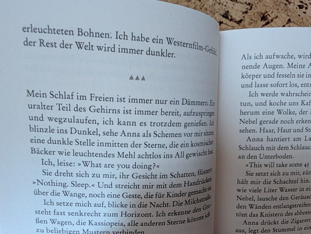 Diese möchte sich in gottverlassenen Dörfern von Italien beim alleinigen Wandern und Klettern bis zur völligen Erschöpfung endlich wieder so physisch spüren, dass es auch ihre Psyche heilen kann. So hat sie gleich nach dem Erklimmen des ersten Gipfels ihr Handy runtergeworfen, freut sich aber dann nach dem ersten Schrecken doch sehr über die Begegnung mit einer jungen Frau namens Anna einige Tage später, deren Job darin besteht, Rinder quer durch Europa bis in die Türkei im Transporter zu fahren. Der Roman ist so authentisch und fesselnd geschrieben, dass man sich sofort nach den ersten Seiten der Lektüre mit der Protagonistin identifiziert und mit ihr im Geiste mitwandert, mitleidet und quasi alles mit ihr gemeinsam erlebt. Die beiden Frauen könnten unterschiedlicher nicht sein: die eine ist eine gut bezahlte, kinderlose Lehrerin, welche nach ihrer Aussage „100 %“-Stress empfindet, während Anna Mutter einer 15-jährigen Tochter ist, den harten und schlecht bezahlten Beruf einer LKW-Fahrerin ausübt, aber ihrer Aussage nach nur „50%“ Stress empfindet.