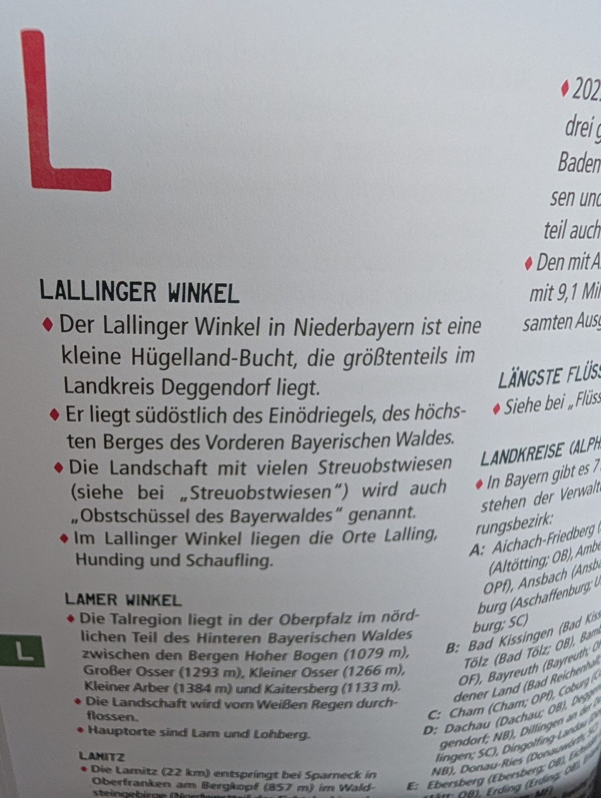 Ganz anders verhält es sich bei dieser Neuerscheinung, die alphabetisch geordnet ist, so dass man alles Gewünschte ausgesprochen einfach nachschlagen kann und wirklich erstaunlich breitgefächerte Informationen gebündelt in einem Buch findet. So beginnt das Werk sofort mit dem allerersten Eintrag in Form meiner geliebten Abens, welche wohl auch nicht allen ein Begriff sein wird und berücksichtigt bei dem ersten Buchstaben des Alphabets ebenso die älteste Stadt Deutschlands als auch die Allianzarena, die Allgäuer Alpen oder aber auch das Annafest und unseren Hausfluss in Form der Amper. Man findet immer wieder sehr anschauliche Grafiken, so dass man sich die einzelnen Informationen deutlich besser merken kann. So werden z.B. die fünf tiefsten Seen in Bayern auch grafisch dargestellt und in das Verhältnis mit der Höhe des Regensburger Doms gesetzt oder aber man erhält einen sehr übersichtlichen und farbig gestalteten Überblick über alle Landkreise und kreisfreie Städte in Bayern.