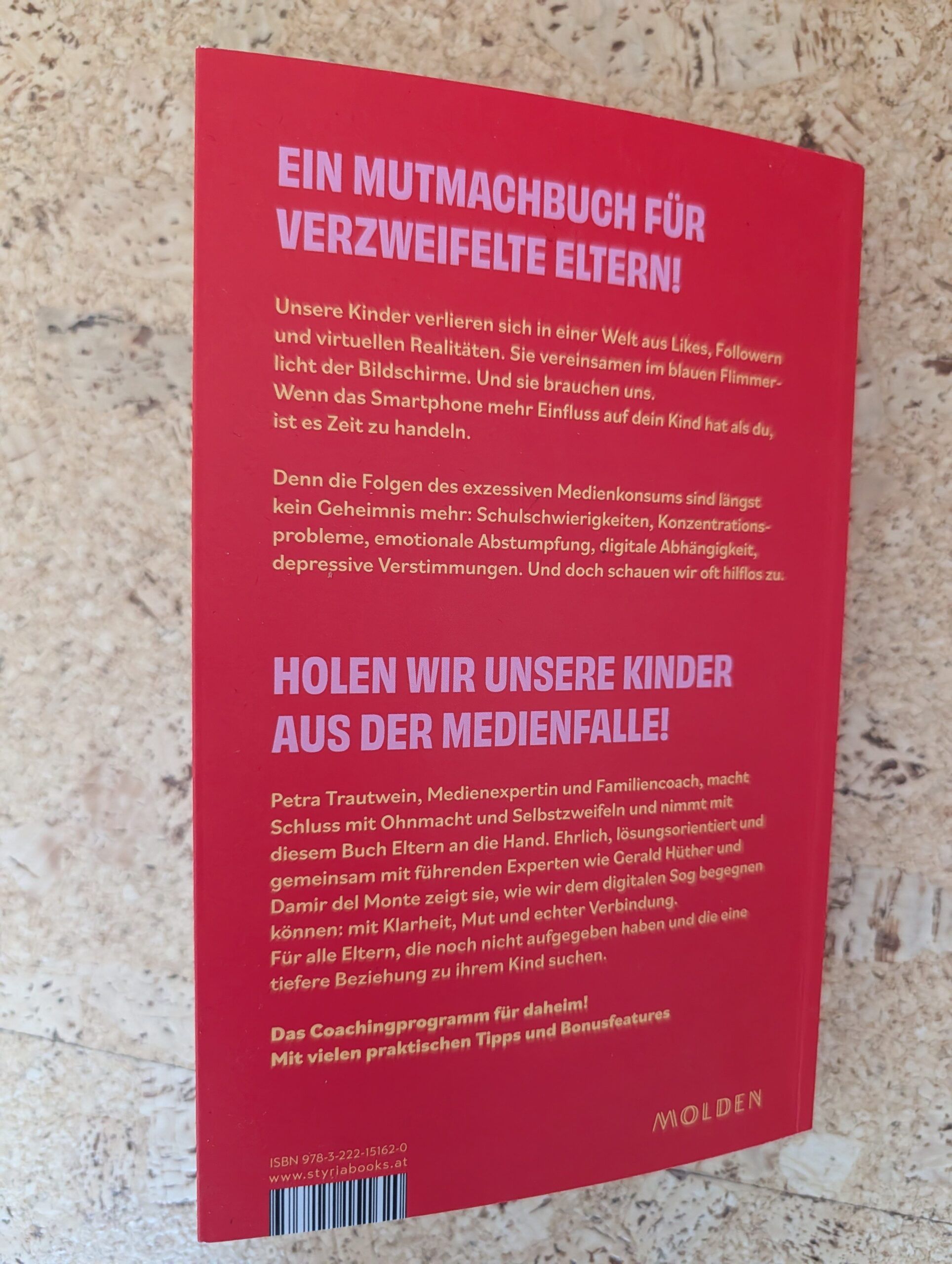 Kratzbürstigen Pubertierenden uneingeschränkt Liebe zu geben, fällt mit Sicherheit nicht in allen Situationen leicht, aber der Zusatzbutton auf dem Titelbild mit „Kinder brauchen Liebe und kein WLAN“ enthält viel Wahres. Dabei will das ganz aktuell im Molden-Verlag erschienene Werk „Handyfrei“ von Petra Trautwein keinesfalls die digitalen Geräte verteufeln, sondern plädiert viel mehr für „einen gesunden Umgang mit Handy &Medien“. Die Autorin ist nicht nur eine renommierte Expertin und vielbeschäftigte Vortragsrednerin, sondern auch Gründerin der Smarts Kids Academy, sowie Familiencoachin. Die dreifache Mutter vermittelt auf über 250 Seiten dieses ganz aktuell im Molden-Verlag erschienen Werkes gleichermaßen viel theoretisches Wissen als auch ganz praktische Lebenshilfe, wie es gelingt, die Bildschirmzeit der Kinder deutlich zu verringern und diese wieder ins echte Leben zurückzuholen. Dabei wird der so großen Bedeutung der Freundschaft mit der Überschrift „Selbstbewusste Kinder haben Freunde, keine Handys“ ein ganzes Kapitel gewidmet und es wird sehr stark eine liebevolle Grenzsetzung befürwortet.