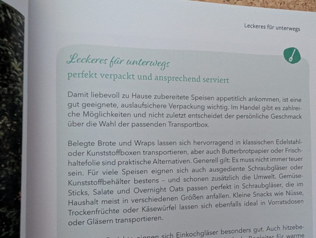 Alle Rezepte eint die Tatsache, dass sie absolut gelingsicher beschrieben sind und sich ohne größeren Zeitaufwand in kleinen wie auch in größeren Mengen zubereiten lassen. Am Schluss findet man noch unter „Tanjas 5 Tipps für einen langen Tag“ äußerst nützliche und rasch umzusetzende Alternativen, dank denen es einem auch während eines sehr langen aushäusigen Tages in keiner Weise nur im Geringsten essenstechnisch langweilig werden könnte.