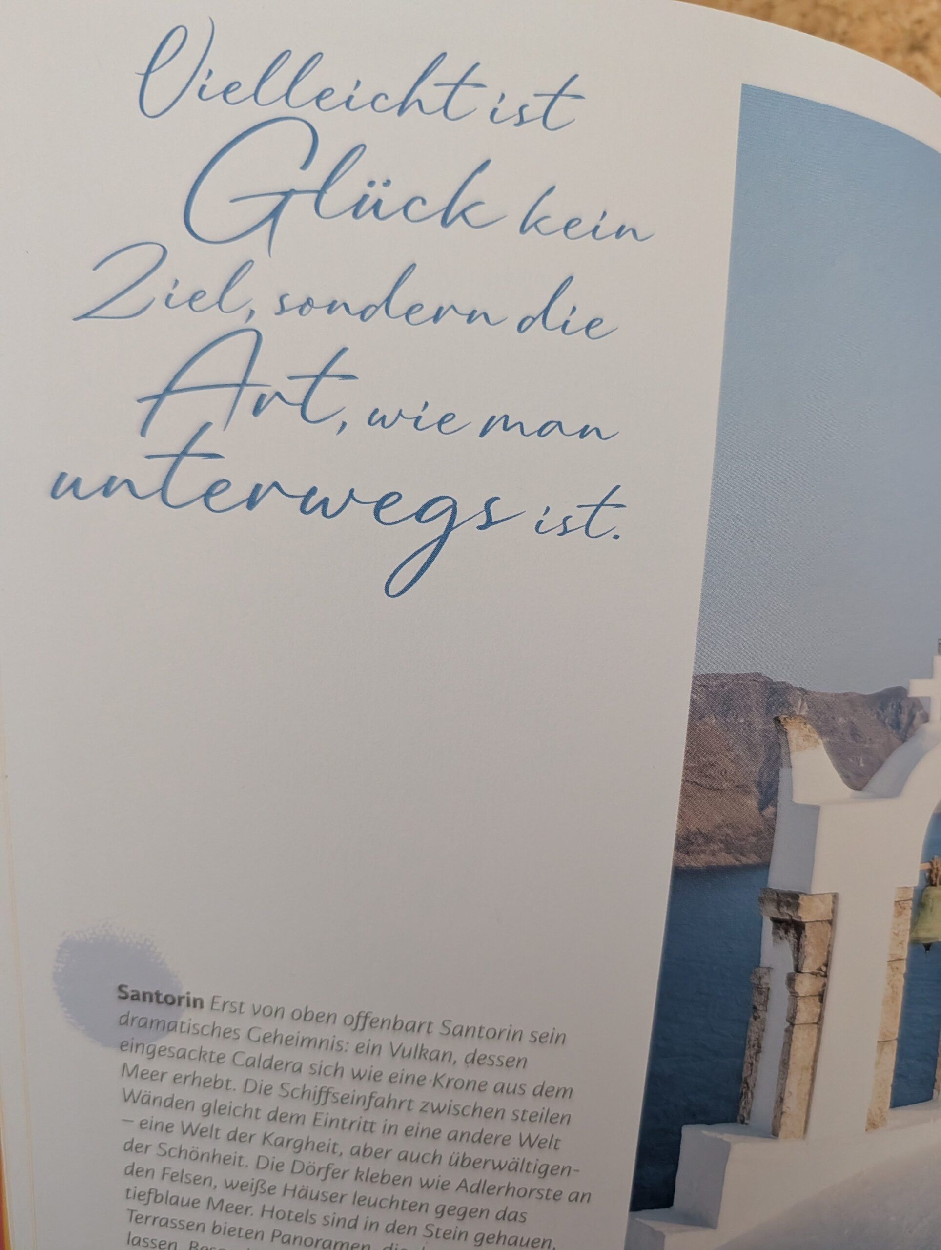 So erhält man auf knapp 100 Seiten nicht nur zahlreiche Reiseinspirationen zu mannigfachen Orten, sondern zugleich farbprächtige Fotos sowie äußerst ansprechende Zitate oder auch Fragen, welche einen optimal zur Selbstreflexion anregen. Dieses Werk ist die perfekte Mischung aus einer Vorstellung der unterschiedlichsten Reiseziele in nah und fern verbunden mit immer wieder neuen Denkanstößen, so dass es im Lauf der Zeit immer besser gelingen wird, unabhängig, ob und wie weit oder oft man sich auf Reisen begibt, die Reise in sein Inneres anzutreten und dabei möglichst viele Glückmomente zu erleben.